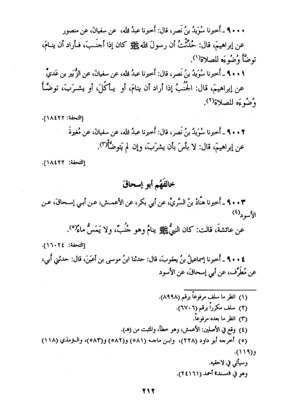 9002 - أَخْبَرَنَا سُوَيْدُ بْنُ نَصْرٍ قَالَ: أَخْبَرَنَا عَبْدُ اللهِ، عَنْ سُفْيَانَ، عَنْ مُغِيرَةَ، عَنْ إِبْرَاهِيمَ قَالَ: «§لَا بَأْسَ بِأَنْ يَشْرَبَ وَإِنْ لَمْ يَتَوَضَّأْ» خَالَفَهُمْ أَبُو إِسْحَاقَ
