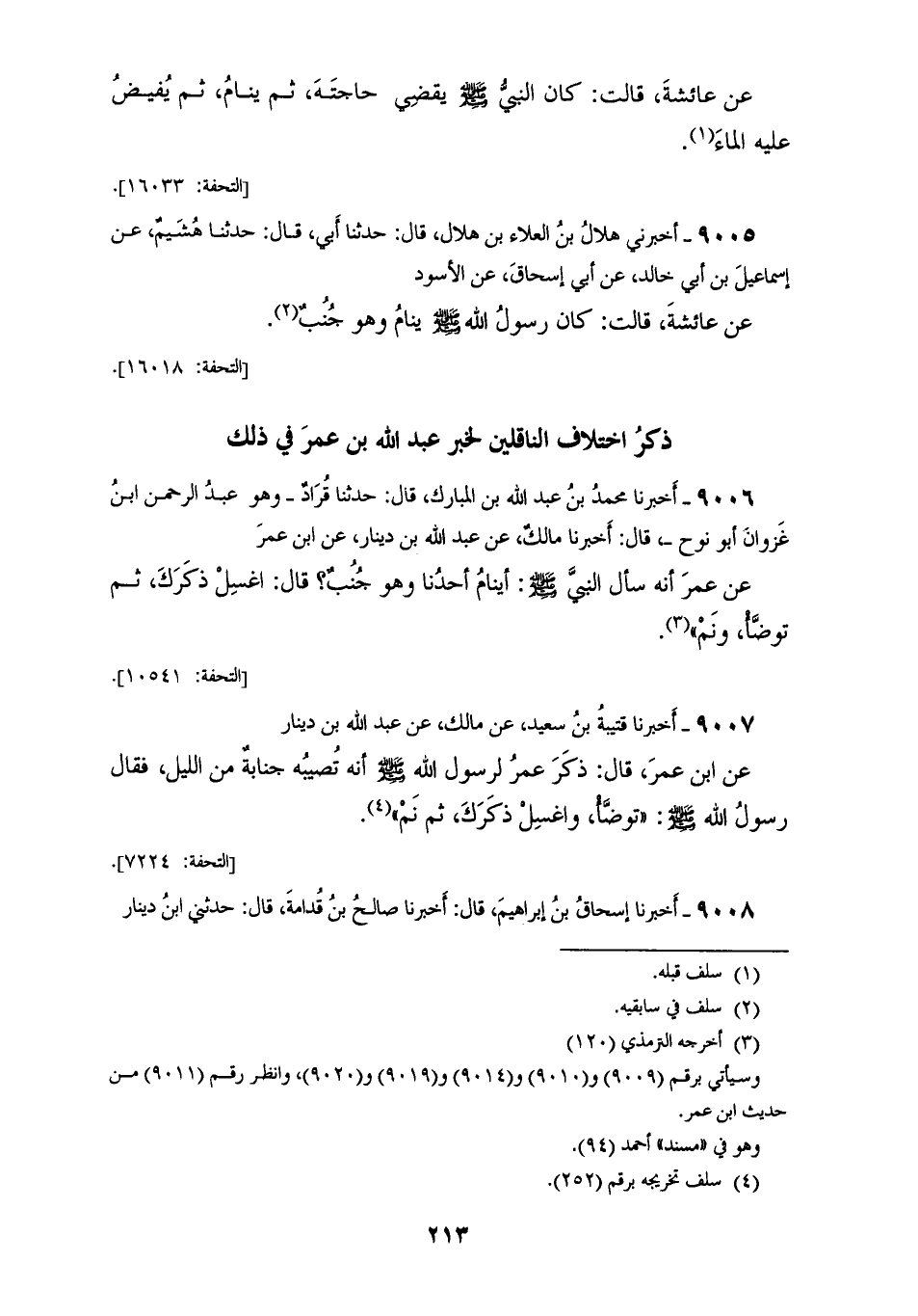 9007 - أَخْبَرَنَا قُتَيْبَةُ بْنُ سَعِيدٍ، عَنْ مَالِكٍ، عَنْ عَبْدِ اللهِ بْنِ دِينَارٍ، عَنِ ابْنِ عُمَرَ قَالَ: ذَكَرَ عُمَرُ لِرَسُولِ اللهِ صَلَّى اللهُ عَلَيْهِ وَسَلَّمَ أَنَّهُ §تُصِيبُهُ جَنَابَةٌ مِنَ اللَّيْلِ فَقَالَ رَسُولُ اللهِ صَلَّى اللهُ عَلَيْهِ وَسَلَّمَ: «تَوَضَّأْ وَاغْسِلْ ذَكَرَكَ ثُمَّ نَمْ»