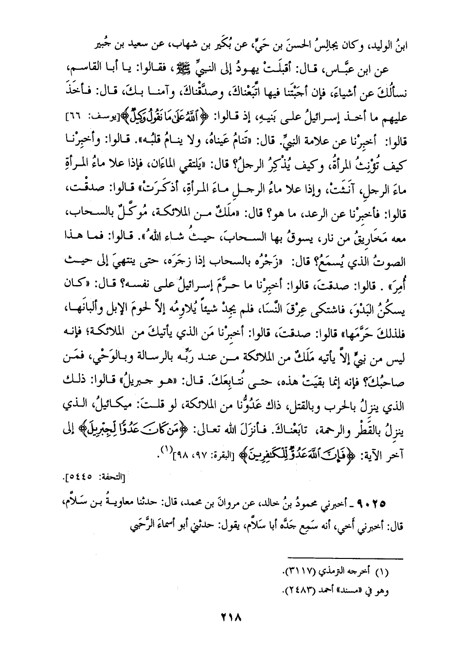 9024 - أَخْبَرَنَا أَحْمَدُ بْنُ يَحْيَى الصُّوفِيُّ قَالَ: حَدَّثَنَا أَبُو نُعَيْمٍ قَالَ: حَدَّثَنَا عَبْدُ اللهِ بْنُ الْوَلِيدِ، وَكَانَ يُجَالِسُ الْحَسَنَ بْنَ حَيٍّ عَنْ بُكَيْرِ بْنِ شِهَابٍ، عَنْ سَعِيدِ بْنِ جُبَيْرٍ، عَنِ ابْنِ عَبَّاسٍ قَالَ: §أَقْبَلَتْ يَهُودُ إِلَى النَّبِيِّ صَلَّى اللهُ عَلَيْهِ وَسَلَّمَ فَقَالُوا: يَا أَبَا الْقَاسِمِ «نَسْأَلُكَ عَنْ أَشْيَاءَ، فَإِنْ أَجَبْتَنَا فِيهَا اتَّبَعْنَاكَ وَصَدَّقْنَاكَ وَآمَنَّا بِكَ» قَالَ: فَأَخَذَ عَلَيْهِمْ مَا أَخَذَ إِسْرَائِيلُ عَلَى بَنِيهِ إِذْ قَالُوا: {اللهُ عَلَى مَا نَقُولُ وَكِيلٌ} [يوسف: 66] قَالُوا: أَخْبِرْنَا عَنْ عَلَامَةِ النَّبِيِّ قَالَ: «تَنَامُ عَيْنَاهُ وَلَا يَنَامُ قَلْبُهُ» قَالُوا: وَأَخْبِرْنَا كَيْفَ تُؤْنِثُ الْمَرْأَةُ وَكَيْفَ يُذْكِرُ الرَّجُلُ؟ قَالَ: «يَلْتَقِي الْمَاءَانِ، فَإِذَا عَلَا مَاءُ الْمَرْأَةِ مَاءَ الرَّجُلِ آنَثَتْ، وَإِذَا عَلَا مَاءُ الرَّجُلِ مَاءَ الْمَرْأَةِ أَذْكَرَتْ» قَالُوا: صَدَقْتَ قَالُوا: فَأَخْبِرْنَا عَنِ الرَّعْدِ مَا هُوَ؟ قَالَ: «مَلَكٌ مِنَ الْمَلَائِكَةِ، مُوكَلٌّ بِالسَّحَابِ مَعَهُ مَخَارِيقُ مِنْ نَارٍ يَسُوقُ بِهَا السَّحَابِ حَيْثُ شَاءَ اللهُ» قَالُوا: فَمَا هَذَا الصَّوْتُ الَّذِي يُسْمَعُ قَالَ: «زَجْرُهُ بِالسَّحَابِ إِذَا زَجَرَهُ حَتَّى يَنْتَهِي إِلَى حَيْثُ أُمِرَ» قَالُوا: صَدَقْتَ قَالُوا: أَخْبِرْنَا مَا حَرَّمَ إِسْرَائِيلُ عَلَى نَفْسِهِ قَالَ: كَانَ يُسْكُنُ الْبَدْوَ فَاشْتَكَى عِرْقَ النَّسَا فَلَمْ يَجِدْ شَيْئًا يُلَاوِمُهُ إِلَّا لُحُومَ الْإِبِلِ وَأَلْبَانَهَا فَلِذَلِكَ حَرَّمَهَا قَالُوا: صَدَقْتَ قَالُوا: أَخْبِرْنَا مَنِ الَّذِي يَأْتِيكَ مِنَ الْمَلَائِكَةِ، فَإِنَّهُ لَيْسَ مِنْ نَبِيٍّ إِلَّا يَأْتِيَهُ مَلَكٌ مِنَ الْمَلَائِكَةِ مِنْ عِنْدِ رَبِّهِ بِالرِّسَالَةِ وَبِالْوُحْيِ فَمَنْ صَاحِبُكَ؟ فَإِنَّهُ إِنَّمَا بَقِيَتْ هَذِهِ حَتَّى نُتَابِعَكَ قَالَ: «هُوَ جِبْرِيلُ» قَالُوا: ذَلِكَ الَّذِي يَنْزِلُ بِالْحرْبِ وَبِالْقَتْلِ ذَاكَ عَدُوُّنَا مِنَ الْمَلَائِكَةِ لَوْ قُلْتَ: مِيكَائِيلُ الَّذِي يَنْزِلُ بِالْقَطْرِ، وَالرَّحْمَةِ تَابَعْنَاكَ، فَأَنْزَلَ اللهُ تَعَالَى {مَنْ كَانَ عَدُوًّا لِجِبْرِيلَ} [البقرة: 97] إِلَى آخِرِ الْآيَةِ {فَإِنَّ اللهَ عَدُوٌّ لِلْكَافِرِينَ} [البقرة: 98]