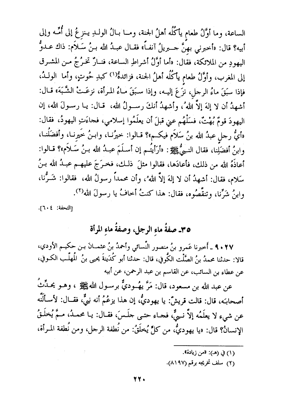 9026 - أَخْبَرَنَا إِسْمَاعِيلُ بْنُ مَسْعُودٍ، قَالَ: حَدَّثَنَا بِشْرُ بْنُ الْمُفَضَّلِ، عَنْ حُمَيْدٍ، قَالَ: حَدَّثَنَا أَنَسٌ، أَنَّ عَبْدَ اللهِ بْنَ سَلَامٍ، بَلَغَهُ مَقْدَمُ النَّبِيِّ صَلَّى اللهُ عَلَيْهِ وَسَلَّمَ الْمَدِينَةَ فَأَتَاهُ فَسَأَلَهُ عَنْ أَشْيَاءَ، فَقَالَ: إِنِّي سَائِلُكَ عَنْ ثَلَاثٍ لَا يَعْلَمُهُنَّ إِلَّا نَبِيٌّ: مَا أَوَّلُ أَشْرَاطِ السَّاعَةِ؟ وَمَا أَوَّلُ طَعَامٍ يَأْكُلُهُ أَهْلُ الْجَنَّةِ؟ وَمَا بَالُ الْوَلَدِ يَنْزِعُ إِلَى أُمِّهِ وَإِلَى أَبِيهِ؟ قَالَ: أَخْبَرَنِي بِهِنَّ جِبْرِيلُ آنِفًا، فَقَالَ: عَبْدُ اللهِ بْنُ سَلَامٍ ذَاكَ عَدُوُّ الْيَهُودِ مِنَ الْمَلَائِكَةِ، فَقَالَ: «§أَمَّا أَوَّلُ أَشْرَاطِ السَّاعَةِ، فَنَارٌ تَخْرُجُ مِنَ الْمَشْرِقِ إِلَى الْمَغْرِبِ، وَأَوَّلُ طَعَامٍ يَأْكُلُهُ أَهْلُ الْجَنَّةِ، فَزَائِدَةُ كَبِدِ حُوتٍ، وَأَمَّا الْوَلَدُ فَإِذَا سَبَقَ مَاءُ الرَّجُلِ نَزَعَ إِلَيْهِ، وَإِذَا سَبَقَ مَاءُ الْمَرْأَةِ نَزَعَتِ الشَّبَهَ» قَالَ: أَشْهَدُ أَنَّ لَا إِلَهَ إِلَّا اللهُ وَأَشْهَدُ أَنَّكَ رَسُولُ اللهِ قَالَ: يَا رَسُولَ اللهِ، إِنَّ الْيَهُودَ قَوْمٌ بُهُتٌ فَسَلْهُمْ عَنِّي قَبْلَ أَنْ يَعْلَمُوا إِسْلَامِي، فَجَاءَتِ الْيَهُودُ، فَقَالَ: أَيُّ رَجُلٍ عَبْدُ اللهِ بْنُ سَلَامٍ فِيكُمْ؟ قَالُوا: خَيْرُنَا، وَابْنُ خَيْرِنَا، وَأَفْضَلُنَا، وَابْنُ أَفْضَلِنَا، فَقَالَ النَّبِيُّ صَلَّى اللهُ عَلَيْهِ وَسَلَّمَ: «أَرَأَيْتُمْ إِنْ أَسْلَمَ عَبْدُ اللهِ بْنُ سَلَامٍ» قَالُوا: أَعَاذَهُ اللهُ مِنْ ذَلِكَ فَأَعَادَهَا، فَقَالُوا مِثْلَ ذَلِكَ فَخَرَجَ عَلَيْهِمْ عَبْدُ اللهِ بْنُ سَلَامٍ، فَقَالَ: أَشْهَدُ أَنَّ لَا إِلَهَ إِلَّا اللهُ، وَأَنَّ مُحَمَّدًا رَسُولُ اللهِ، فَقَالُوا: شَرُّنَا وَابْنً شَرِّنَا وَتَنَقَّصُوهُ، فَقَالَ: هَذَا كُنْتُ أَخَافُ يَا رَسُولَ اللهِ