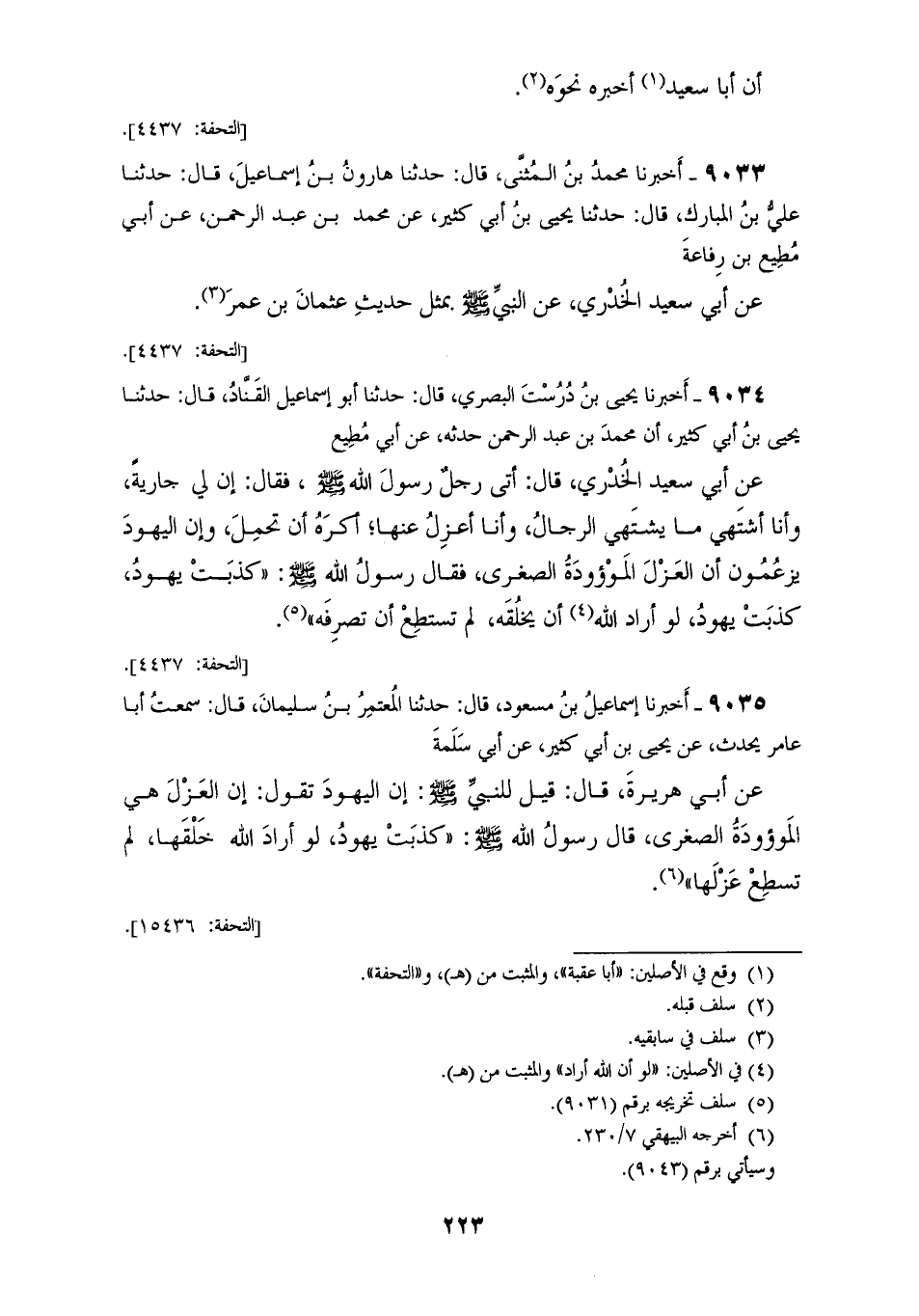 9034 - أَخْبَرَنَا يَحْيَى بْنُ دُرُسْتٍ الْبَصْرِيُّ، قَالَ: حَدَّثَنَا أَبُو إِسْمَاعِيلَ الْقَنَّادُ، قَالَ: حَدَّثَنَا يَحْيَى بْنُ أَبِي كَثِيرٍ، أَنَّ مُحَمَّدَ بْنَ عَبْدِ الرَّحْمَنِ، حَدَّثَهُ عَنْ أَبِي مُطِيعٍ، عَنْ أَبِي سَعِيدٍ الْخُدْرِيِّ، قَالَ: أَتَى رَجُلٌ رَسُولَ اللهِ صَلَّى اللهُ عَلَيْهِ وَسَلَّمَ، فَقَالَ: إِنَّ لِي جَارِيَةً وَأنا أَشْتَهِي مَا يَشْتَهِي الرِّجَالُ، وَأنا أَعْزِلُ عَنْهَا أَكْرَهُ أَنْ تَحْمِلَ، وَإِنَّ الْيَهُودَ يَزْعُمُونَ أَنَّ الْعَزْلَ الْمَوْءُودَةُ الصُّغْرَى، فَقَالَ: رَسُولُ اللهِ صَلَّى اللهُ عَلَيْهِ وَسَلَّمَ: «§كَذَبَتْ يَهُودُ، كَذَبَتْ يَهُودُ، لَوْ أَنَّ اللهَ أَرَادَ أَنْ يَخْلُقَهُ لَمْ تَسْتَطِعْ أَنْ تَصْرِفَهُ»