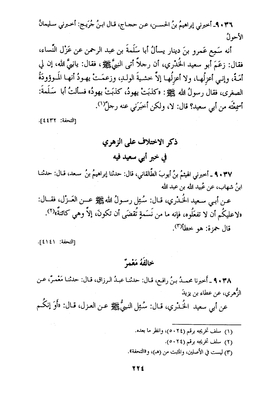 9038 - أَخْبَرَنَا مُحَمَّدُ بْنُ رَافِعٍ، قَالَ: حَدَّثَنَا عَبْدُ الرَّزَّاقِ، قَالَ: حَدَّثَنَا مَعْمَرٌ، عَنِ الزُّهْرِيِّ، عَنْ عَطَاءِ بْنِ يَزِيدَ، عَنْ أَبِي سَعِيدٍ الْخُدْرِيِّ، قَالَ: سُئِلَ النَّبِيُّ صَلَّى اللهُ عَلَيْهِ وَسَلَّمَ عَنِ الْعَزْلِ، قَالَ: «§أَوَإِنَّكُمْ لَتَفْعَلُونَ؟» قَالُوا: نَعَمْ قَالَ: «فَلَا عَلَيْكُمْ أَنْ لَا تَفْعَلُوا، فَإِنَّ اللهَ لَمْ يَقْضِ لِنَفْسٍ أَنْ يَخْلُقَهَا، إِلَّا وَهِيَ كَائِنَةٌ». قَالَ حَمْزَةُ: وَهُوَ أَيْضًا خَطَأٌ. خَالَفَهُ الزُّبَيْدِيُّ
