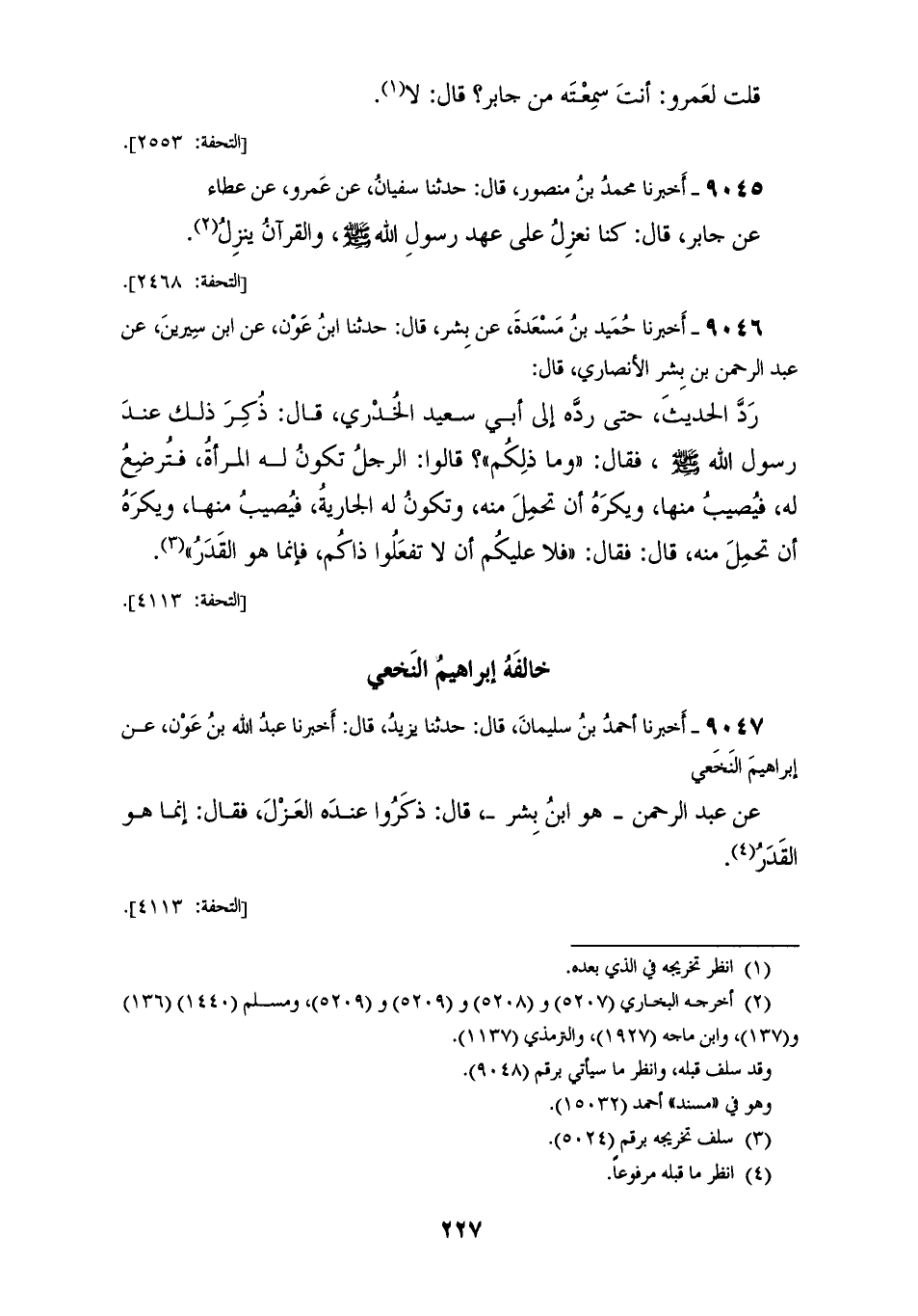 9046 - أَخْبَرَنَا حُمَيْدُ بْنُ مَسْعَدَةَ، عَنْ بِشْرٍ، قَالَ: حَدَّثَنَا ابْنُ عَوْنٍ، عَنِ ابْنِ سِيرِينَ، عَنْ عَبْدِ الرَّحْمَنِ بْنِ بِشْرٍ الْأَنْصَارِيِّ قَالَ: رَدَّ الْحَدِيثَ حَتَّى رَدَّهُ إِلَى أَبِي سَعِيدٍ الْخُدْرِيِّ قَالَ: ذُكِرَ ذَلِكَ عِنْدَ رَسُولِ اللهِ صَلَّى اللهُ عَلَيْهِ وَسَلَّمَ، فَقَالَ: «وَمَا ذَلِكُمْ؟» قَالُوا: §الرَّجُلُ تَكُونُ لَهُ الْمَرْأَةُ فَتُرْضِعُ لَهُ فَيُصِيبُ مِنْهَا، وَيَكْرَهُ أَنْ تَحْمِلَ مِنْهُ، وَتَكُونُ لَهُ الْجَارِيَةُ فَيُصِيبُ مِنْهَا، وَيَكْرَهُ أَنْ تَحْمِلَ مِنْهُ قَالَ: فَقَالَ: «فَلَا عَلَيْكُمْ أَنْ لَا تَفْعَلُوا ذَاكُمْ، فَإِنَّمَا هُوَ الْقَدَرُ» خَالَفَهُ إِبْرَاهِيمُ النَّخْعِيُّ