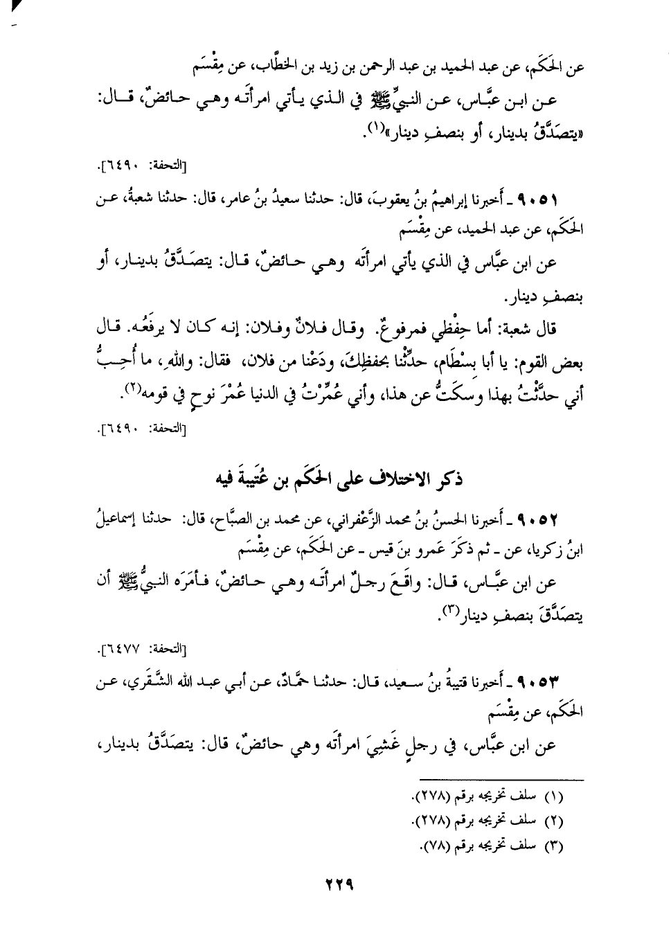9050 - أَخْبَرَنَا إِسْحَاقُ بْنُ إِبْرَاهِيمَ، قَالَ: أَخْبَرَنَا مُحَمَّدُ بْنُ جَعْفَرٍ، قَالَ: حَدَّثَنَا شُعْبَةُ، عَنِ الْحَكَمِ، عَنْ عَبْدِ الْحَمِيدِ بْنِ عَبْدِ الرَّحْمَنِ بْنِ زَيْدِ بْنِ الْخَطَّابِ، عَنْ مِقْسَمٍ، عَنِ ابْنِ عَبَّاسٍ، عَنِ النَّبِيِّ صَلَّى اللهُ عَلَيْهِ وَسَلَّمَ فِي الَّذِي يَأْتِي امْرَأَتَهُ وَهِيَ حَائِضٌ قَالَ: «§يَتَصَدَّقُ بِدِينَارٍ، أَوْ بِنِصْفِ دِينَارٍ»