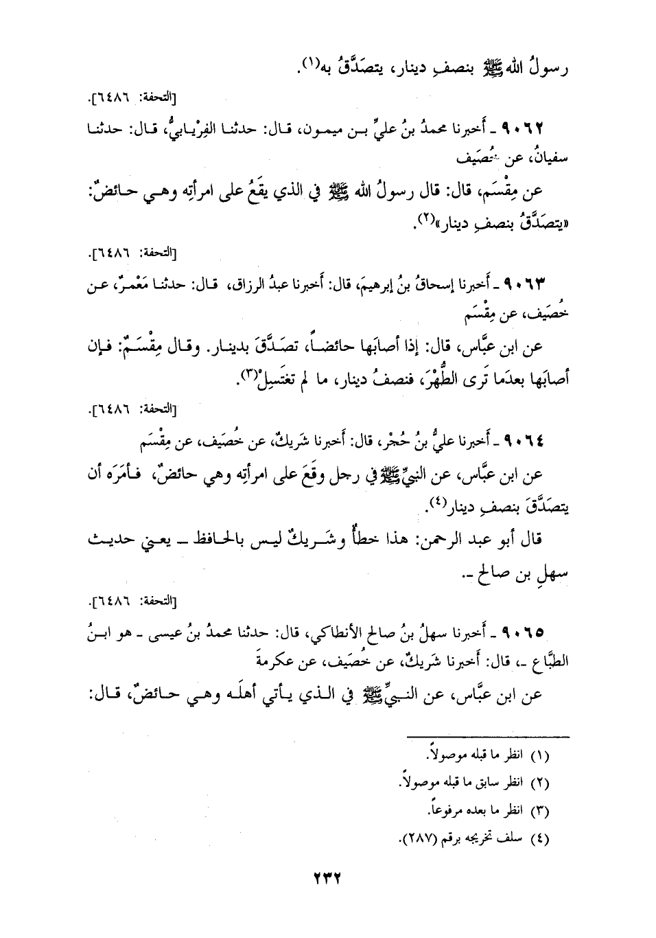 9064 - أَخْبَرَنَا عَلِيُّ بْنُ حُجْرٍ قَالَ: أَخْبَرَنَا شَرِيكٌ، عَنْ خُصَيْفٍ، عَنْ مِقْسَمٍ، عَنِ ابْنِ عَبَّاسٍ، عَنِ النَّبِيِّ صَلَّى اللهُ عَلَيْهِ وَسَلَّمَ فِي §رَجُلٍ وَقَعَ عَلَى امْرَأَتِهِ وَهِيَ حَائِضٌ فَأَمَرَهُ أَنْ يَتَصَدَّقَ بِنِصْفِ دِينَارٍ " قَالَ أَبُو عَبْدِ الرَّحْمَنِ: «هَذَا خَطَأٌ وَشَرِيكٌ لَيْسَ بِالْحَافِظِ، يَعْنِي حَدِيثَ سَهْلِ بْنِ صَالِحٍ»