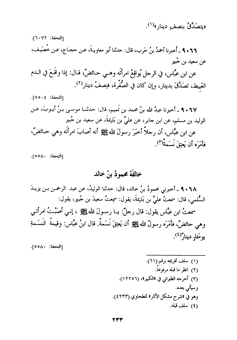 9067 - أَخْبَرَنَا عَبْدُ اللهِ بْنُ مُحَمَّدِ بْنِ تَمِيمٍ قَالَ: حَدَّثَنَا مُوسَى بْنُ أَيُّوبَ، عَنِ الْوَلِيدِ بْنِ مُسْلِمٍ، عَنِ ابْنِ جَابِرٍ، عَنْ عَلِيِّ بْنِ بَذِيمَةَ، عَنْ سَعِيدِ بْنِ جُبَيْرٍ، عَنِ ابْنِ عَبَّاسٍ، أَنَّ رَجُلًا أَخْبَرَ رَسُولَ اللهِ صَلَّى اللهُ عَلَيْهِ وَسَلَّمَ أَنَّهُ «§أَصَابَ امْرَأَتَهُ، وَهِيَ حَائِضٌ فَأَمَرَهُ أَنْ يَعْتِقَ نَسَمَةً» خَالَفَهُ مَحْمُودُ بْنُ خَالِدٍ