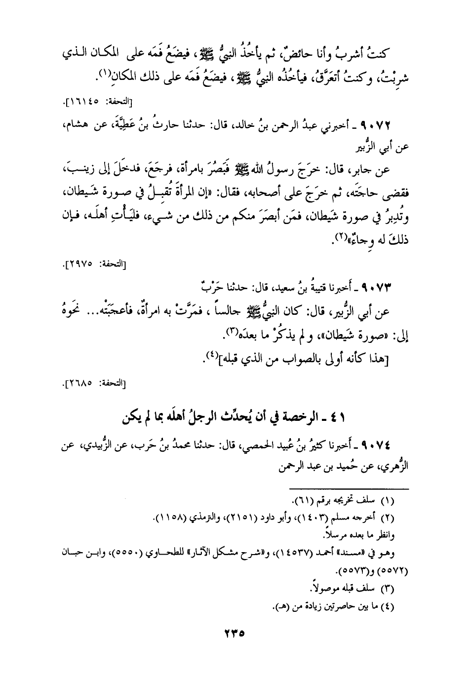 9073 - أَخْبَرَنَا قُتَيْبَةُ بْنُ سَعِيدٍ قَالَ: حَدَّثَنَا حَرْبٌ، عَنْ أَبِي الزُّبَيْرِ قَالَ: §كَانَ النَّبِيُّ صَلَّى اللهُ عَلَيْهِ وَسَلَّمَ جَالِسًا فَمَرَّتْ بِهِ امْرَأَةٌ فَأَعْجَبَتْهُ نَحْوَهُ إِلَى صُورَةِ شَيْطَانٍ، وَلَمْ يَذْكُرْ مَا بَعْدَهُ هَذَا كَأَنَّهُ أَوْلَى بِالصَّوَابِ مِنَ الَّذِي قَبْلَهُ