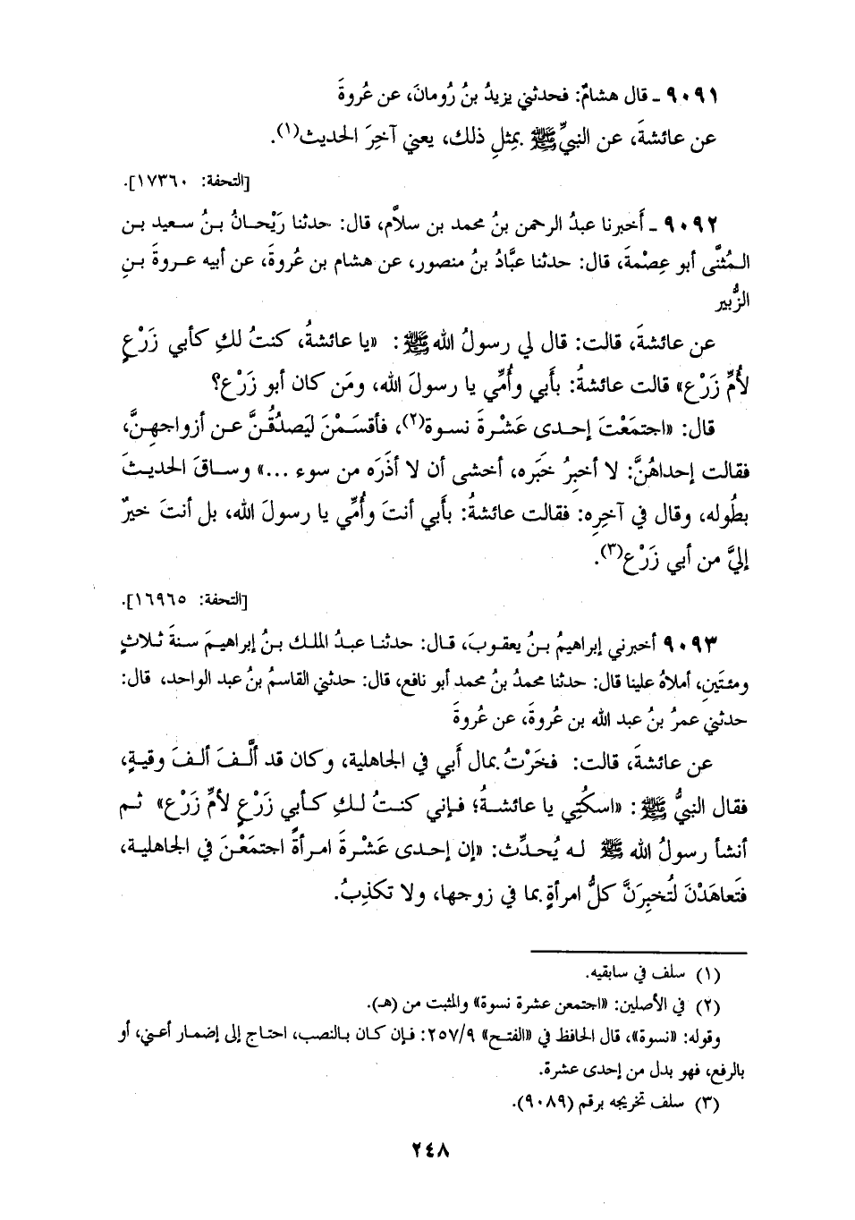 9092 - أَخْبَرَنَا عَبْدُ الرَّحْمَنِ بْنُ مُحَمَّدِ بْنِ سَلَامٍ قَالَ: حَدَّثَنَا رَيْحَانُ بْنُ سَعِيدِ بْنِ الْمُثَنَّى أَبُو عِصْمَةَ قَالَ: حَدَّثَنَا عَبَّادُ بْنُ مَنْصُورٍ، عَنْ هِشَامِ بْنِ عُرْوَةَ، عَنْ أَبِيهِ عُرْوَةَ بْنِ الزُّبَيْرِ، عَنْ عَائِشَةَ قَالَتْ: قَالَ لِي رَسُولُ اللهِ صَلَّى اللهُ عَلَيْهِ وَسَلَّمَ: يَا عَائِشَةُ «§كُنْتُ لَكِ كَأَبِي زَرْعٍ لِأُمِّ زَرْعٍ» قَالَتْ عَائِشَةُ: «بِأَبِي وَأُمِّي يَا رَسُولَ اللهِ، وَمَنْ كَانَ أَبُو زَرْعٍ؟» قَالَ: «اجْتَمَعَتْ إِحْدَى عَشْرَةَ نِسْوَةٍ، فَأَقْسَمْنَ لَيَصْدُقْنَ عَنْ أَزْوَاجِهِنَّ» فَقَالَتْ إِحْدَاهُنَّ: «لَا أُخْبِرُ خَبَرَهُ أَخْشَى أَنْ لَا أَذَرَهُ مِنْ سُوءٍ، وَسَاقَ الْحَدِيثَ بِطُولِهِ» وَقَالَ فِي آخِرِهِ: فَقَالَتْ عَائِشَةُ بِأَبِي أَنْتَ وَأُمِّي يَا رَسُولَ اللهِ، بَلْ أَنْتَ خَيْرٌ إِلَيَّ مِنْ أَبِي زَرْعٍ