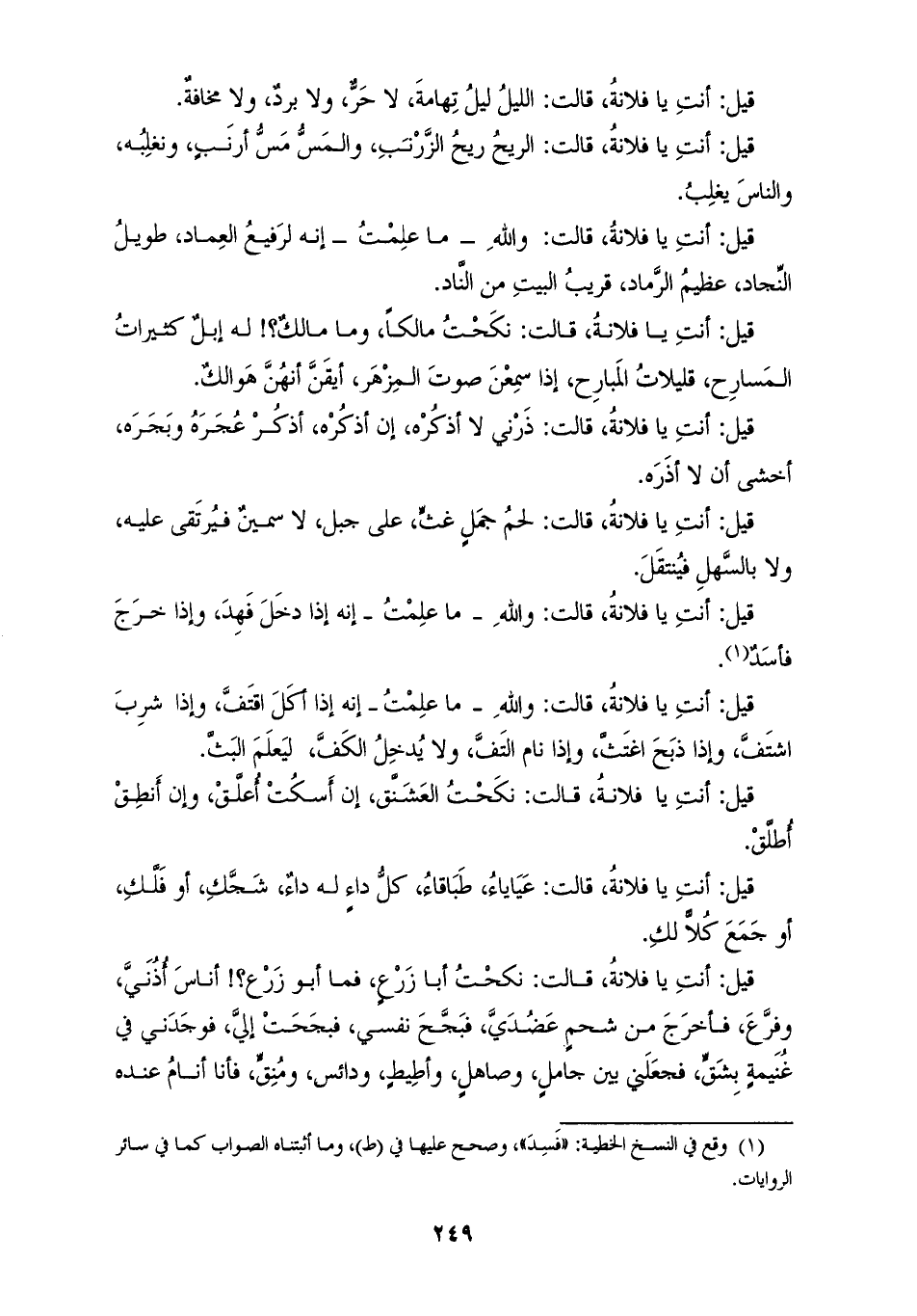 9093 - أَخْبَرَنِي إِبْرَاهِيمُ بْنُ يَعْقُوبَ قَالَ: حَدَّثَنَا عَبْدُ الْمَلِكِ بْنُ إِبْرَاهِيمَ، سَنَةَ ثَلَاثٍ وَمِائَتَيْنِ أَمْلَاهُ عَلَيْنَا، قَالَ: حَدَّثَنَا مُحَمَّدُ بْنُ مُحَمَّدٍ أَبُو نَافِعٍ قَالَ: حَدَّثَنِي الْقَاسِمُ بْنُ عَبْدِ الْوَاحِدِ قَالَ: حَدَّثَنِي عُمَرُ بْنُ عَبْدِ اللهِ بْنِ عُرْوَةَ، عَنْ عُرْوَةَ، عَنْ عَائِشَةَ قَالَتْ: «فَخُرْتُ بِمَالِ أَبِي فِي الْجَاهِلِيَّةِ، وَكَانَ قَدْ أَلَّفَ أَلْفَ وَقِيَّةٍ» فَقَالَ النَّبِيُّ صَلَّى اللهُ عَلَيْهِ وَسَلَّمَ: §اسْكُتِي يَا عَائِشَةُ، فَإِنِّي كُنْتُ لَكِ كَأَبِي زَرْعٍ لِأُمِّ زَرْعٍ، ثُمَّ أَنْشَأَ رَسُولُ اللهِ صَلَّى اللهُ عَلَيْهِ وَسَلَّمَ لَهُ يُحَدِّثُ: «إِنَّ إِحْدَى عَشْرَةَ امْرَأَةً اجْتَمَعْنَ فِي الْجَاهِلِيَّةِ، فَتَعَاهَدْنَ لَتُخْبِرَنَّ كُلُّ امْرَأَةٍ بِمَا فِي زَوْجِهَا وَلَا تَكْذِبُ» قِيلَ: أَنْتِ يَا فُلَانَةُ قَالَتِ: «اللَّيْلُ لَيْلُ تِهَامَةَ، لَا حَرَّ، وَلَا بَرْدَ، وَلَا مَخَافَةَ» قِيلَ: أَنْتِ يَا فُلَانَةُ، قَالَتْ: «الرِّيحُ رِيحُ الزَّرْنَبِ، وَالْمَسُّ مَسُّ أَرْنَبِ، وَنَغْلِبُهُ وَالنَّاسَ يَغْلِبُ» قِيلَ: أَنْتِ يَا فُلَانَةُ، قَالَتْ: «وَاللهِ مَا عَلِمْتُ إِنَّهُ لرفيعُ الْعِمَادِ، طَوِيلُ النِّجَادِ، عَظِيمُ الرَّمَادِ، قَرِيبُ الْبَيْتِ مِنَ النَّادِ» قِيلَ: أَنْتِ يَا فُلَانَةُ، قَالَتْ: «نَكَحْتُ مَالِكًا، وَمَا مَالِكٌ لَهُ إِبِلٌ كَثِيرَاتُ الْمَسَارِحِ، قَلِيلَاتُ الْمَبَارِحِ، إِذَا سَمِعْنَ صَوْتَ الْمِزْهَرِ أَيْقَنَّ أَنَّهُنَّ هَوَالِكُ» قِيلَ: أَنْتِ يَا فُلَانَةُ، قَالَتْ: «ذَرْنِي لَا أَذْكُرَهُ، إِنْ أَذْكُرُهُ أَذْكُرُ عُجَرَهُ وَبُجَرَهُ، أَخْشَى أَنْ لَا أَذَرَهُ» قِيلَ: أَنْتِ يَا فُلَانَةُ، قَالَتْ: «لَحْمُ جَمَلٍ غَثٍّ، عَلَى جَبَلٍ لَا سَمِينٍ فَيُرْتَقَى عَلَيْهِ وَلَا بِالسَّهْلِ فَيُنْتَقَلُ» قِيلَ: أَنْتِ يَا فُلَانَةُ، قَالَتْ: «وَاللهِ مَا عَلِمْتُ إِنَّهُ إِذَا دَخَلَ فَهِدَ، وَإِذَا خَرَجَ فَأَسِدَ» -[250]- قِيلَ: أَنْتِ يَا فُلَانَةُ، قَالَتْ: «وَاللهِ مَا عَلِمْتُ أَنَّهُ إِذَا أَكَلَ اقْتَفَّ، وَإِذَا شَرِبَ اشْتَفَّ، وَإِذَا ذَبَحَ اغْتَثَّ، وَإِذَا نَامَ الْتَفَّ، وَلَا يُدْخِلُ الْكَفَّ، لِيَعْلَمَ الْبَثَّ» قِيلَ: أَنْتِ يَا فُلَانَةُ، قَالَتْ: «نَكَحْتُ الْعَشَنَّقَ، إِنْ أَسْكُتْ أُعَلَّقْ، وَإِنْ أَنْطِقْ أُطَلَّقْ» قِيلَ: أَنْتِ يَا فُلَانَةُ، قَالَتْ: «عَيَايَاءُ، طَبَاقَاءُ كُلُّ دَاءٍ لَهُ دَاءٌ، شَجَّكِ، أَوْ فَلَّكِ، أَوْ جَمَعَ كَلَّا لَكِ» قِيلَ أَنْتِ يَا فُلَانَةُ، قَالَتْ: «نَكَحْتُ أَبَا زَرْعٍ، فَمَا أَبُو زَرْعٍ؟ أَنَاسَ أُذُنَيَّ، وَفَرَّعَ فَأَخْرَجَ مِنْ شَحْمِ عَضُدَيَّ، فَبَجَّحَ نَفْسِي فَبَجَحَتْ إِلَيَّ، فَوَجَدَنِي فِي غُنَيْمَةٍ بِشِقٍّ فَجَعَلَنِي بَيْنَ جَامِلٍ وَصَاهِلٍ وَأَطِيطٍ وَدَائِسٍ وَمُنَقٍّ، فَأَنَا أَنَامُ عِنْدَهُ فَأَتَصَبَّحُ، وَأَشْرَبُ فَأَتَقَمَّحُ، وَأَنْطِقُ فَلَا أُقَبَّحُ» ابْنُ أَبِي زَرْعٍ، وَمَا ابْنُ أَبِي زَرْعٍ مَضْجَعُهُ مَسَلُّ الشَّطْبَةِ، وَيُشْبِعُهُ ذِرَاعُ الْجَفْرَةِ، ابْنَةُ أَبِي زَرْعٍ، وَمَا ابْنَةُ أَبِي زَرْعٍ مِلْءُ إِزَارِهَا، وَصَفْرُ رِدَائِهَا، وَزَيْنُ أَبِيهَا، وَزَيْنُ أُمِّهَا، وَحَيْرُ جَارَتِهَا، جَارِيَةُ أَبِي زَرْعٍ، وَمَا جَارِيَةُ أَبِي زَرْعٍ لَا تُخْرِجُ حَدِيثَنَا تَفْتِيشًا، وَلَا تُهْلِكُ مِيرَتَنَا تَبْثِيثًا، فَخَرَجَ مِنْ عِنْدِي، وَالْأَوْطَابُ تُمْخَضُ، فَإِذَا هُوَ بِأُمِّ غُلَامَيْنِ كَالصَّقْرَيْنِ، فَتَزَوَّجَهَا أَبُو زَرْعٍ، وَطَلَّقَنِي، فَاسْتَبْدَلْتُ وَكُلُّ بَدَلٍ أَعْوَرُ، فَنَكَحْتُ شَابً