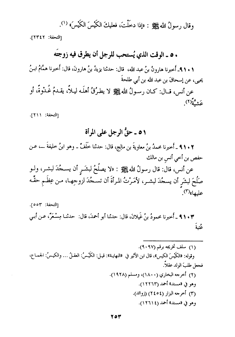 9101 - أَخْبَرَنَا هَارُونُ بْنُ عَبْدِ اللهِ قَالَ: حَدَّثَنَا يَزِيدُ بْنُ هَارُونَ قَالَ: أَخْبَرَنَا هَمَّامُ بْنُ يَحْيَى، عَنْ إِسْحَاقَ بْنِ عَبْدِ اللهِ بْنِ أَبِي طَلْحَةَ، عَنْ أَنَسٍ قَالَ: «§كَانَ رَسُولُ اللهِ صَلَّى اللهُ عَلَيْهِ وَسَلَّمَ لَا يَطْرُقُ أَهْلَهُ لَيْلًا، يَقْدَمُ غُدْوَةً أَوْ عَشِيَّةً»