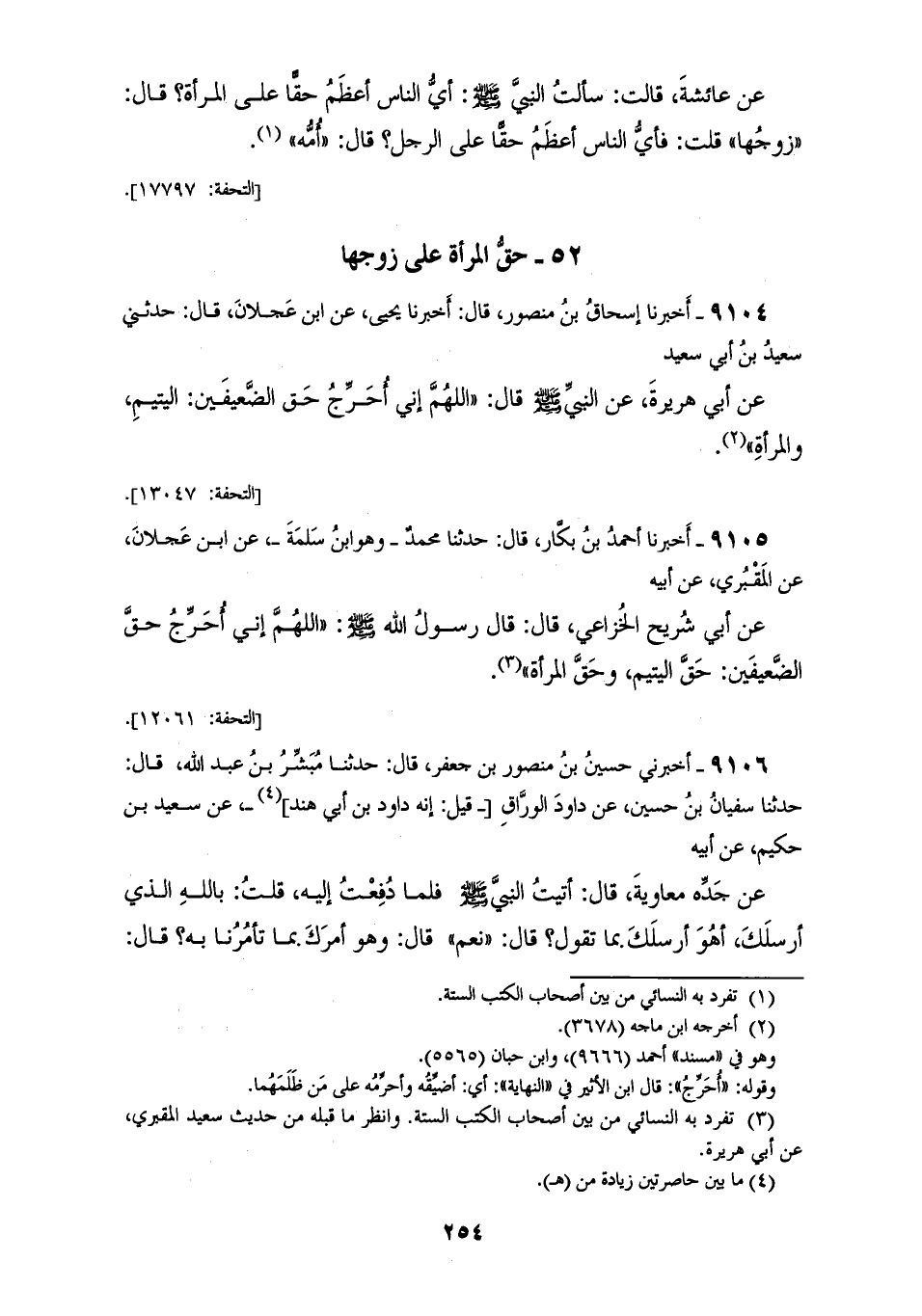 9105 - أَخْبَرَنَا أَحْمَدُ بْنُ بَكَّارٍ قَالَ: حَدَّثَنَا مُحَمَّدٌ وَهُوَ ابْنُ سَلَمَةَ، عَنِ ابْنِ عَجْلَانَ، عَنِ الْمَقْبُرِيِّ، عَنْ أَبِيهِ، عَنْ أَبِي شُرَيْحٍ الْخُزَاعِيِّ قَالَ: قَالَ رَسُولُ اللهِ صَلَّى اللهُ عَلَيْهِ وَسَلَّمَ: «§اللهُمَّ إِنِّي أُحَرِّجُ حَقَّ الضَّعِيفَيْنِ حَقَّ الْيَتِيمِ وَحَقَّ الْمَرْأَةِ»