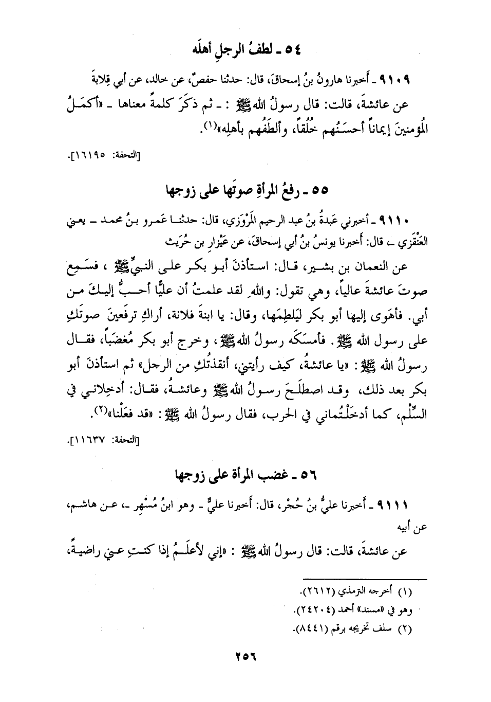 9109 - أَخْبَرَنَا هَارُونُ بْنُ إِسْحَاقَ قَالَ: حَدَّثَنَا حَفْصٌ، عَنْ خَالِدٍ، عَنْ أَبِي قِلَابَةَ، عَنْ عَائِشَةَ قَالَتْ: قَالَ رَسُولُ اللهِ صَلَّى اللهُ عَلَيْهِ وَسَلَّمَ: «§ثُمَّ ذَكَرَ كَلِمَةً مَعْنَاهَا أَكْمَلُ الْمُؤْمِنِينَ إِيمَانًا أَحْسَنَهُمْ خُلُقًا، وَأَلْطَفُهُمْ بِأَهْلِهِ»