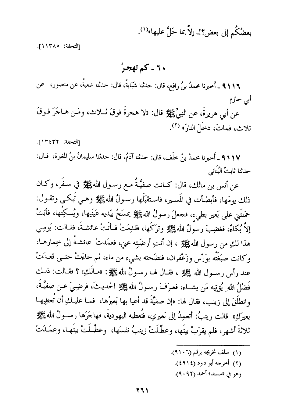 9117 - أَخْبَرَنَا مُحَمَّدُ بْنُ خَلَفٍ قَالَ: حَدَّثَنَا آدَمُ قَالَ: حَدَّثَنَا سُلَيْمَانُ بْنُ الْمُغِيرَةِ قَالَ: حَدَّثَنَا ثَابِتٌ الْبُنَانِيُّ، عَنْ أَنَسِ بْنِ مَالِكٍ قَالَ: §كَانَتْ صَفِيَّةُ مَعَ رَسُولِ اللهِ صَلَّى اللهُ عَلَيْهِ وَسَلَّمَ فِي سَفَرٍ، وَكَانَ ذَلِكَ يَوْمَهَا فَأَبْطَأْتُ فِي الْمَسِيرِ، فَاسْتَقْبَلَهَا رَسُولُ اللهِ صَلَّى اللهُ عَلَيْهِ وَسَلَّمَ وَهِيَ تَبْكِي وَتَقُولُ: «حَمَلْتَنِي عَلَى بَعِيرٍ بَطِيءٍ، فَجَعَلَ رَسُولُ اللهِ صَلَّى اللهُ عَلَيْهِ وَسَلَّمَ يَمْسَحُ بِيَدَيْهِ عَيْنَيْهَا وُيُسْكِتُهَا، فَأَبَتْ إِلَّا بُكَاءً، فَغَضبَ رَسُولُ اللهِ صَلَّى اللهُ عَلَيْهِ وَسَلَّمَ وَتَرْكَهَا، فَقَدِمْتُ» فَأَتَتْ عَائِشَةُ فَقَالَتْ: «يَوْمِي هَذَا لَكِ مِنْ رَسُولِ اللهِ صَلَّى اللهُ عَلَيْهِ وَسَلَّمَ إِنْ أَنْتِ أَرْضَيْتِهِ عَنِّي، فَعَمَدَتْ عَائِشَةُ إِلَى خِمَارِهَا، وَكَانَتْ صَبَغَتْهُ بِوَرْسٍ وَزَعْفَرَانٍ، فَنَضَحَتْهُ بِشَيْءٍ مِنْ مَاءٍ، ثُمَّ جَاءَتْ حَتَّى قَعَدَتْ عِنْدَ رَأْسِ رَسُولِ اللهِ صَلَّى اللهُ عَلَيْهِ وَسَلَّمَ» فَقَالَ لَهَا رَسُولُ اللهِ صَلَّى اللهُ عَلَيْهِ وَسَلَّمَ: «مَا لَكِ؟» فَقَالَتْ: «ذَلِكَ فَضْلُ اللهِ يُؤْتِيَهُ مَنْ يَشَاءُ، فَعَرَفَ رَسُولُ اللهِ صَلَّى اللهُ عَلَيْهِ وَسَلَّمَ الْحَدِيثَ، فَرَضِيَ عَنْ صَفِيَّةَ، وَانْطَلَقَ إِلَى زَيْنَبَ» فَقَالَ لَهَا: «إِنَّ صَفِيَّةَ قَدْ أَعْيَا بِهَا بَعِيرُهَا، فَمَا عَلَيْكِ أَنْ تُعْطِيَهَا بَعِيرَكِ» قَالَتْ زَيْنَبُ: «أَتَعْمَدُ إِلَى بَعِيرِي فَتُعْطِيَهُ الْيَهُودِيَّةَ؟، فَهَاجَرَهَا رَسُولُ اللهِ صَلَّى اللهُ عَلَيْهِ وَسَلَّمَ ثَلَاثَةَ أَشْهُرٍ، فَلَمْ يَقْرَبْ بَيْتَهَا، وَعَطَّلَتْ زَيْنَبُ نَفْسَهَا، وَعَطَّلَتْ بَيْتَهَا، وَعَمَدَتْ إِلَى السَّرِيرِ فَأَسْنَدَتْهُ إِلَى مُؤَخَّرِ الْبَيْتِ، وَأَيَسَتْ مِنْ أَنْ يَأْتِيَهَا رَسُولُ اللهِ صَلَّى اللهُ عَلَيْهِ وَسَلَّمَ، فَبَيْنَا هِيَ ذَاتَ يَوْمٍ، إِذَا بِوَجْسِ رَسُولِ اللهِ صَلَّى اللهُ عَلَيْهِ وَسَلَّمَ، قَدْ دَخَلَ الْبَيْتَ فَوَضَعَ السَّرِيرَ مَوْضِعَهُ» فَقَالَتْ زَيْنَبُ: يَا رَسُولَ اللهِ «جَارِيَتِي فُلَانَةُ قَدْ طَهُرَتْ مِنْ حَيْضَتِهَا الْيَوْمَ، هِيَ لَكَ فَدَخَلَ عَلَيْهَا رَسُولُ اللهِ صَلَّى اللهُ عَلَيْهِ وَسَلَّمَ وَرَضِيَ عَنْهَا»