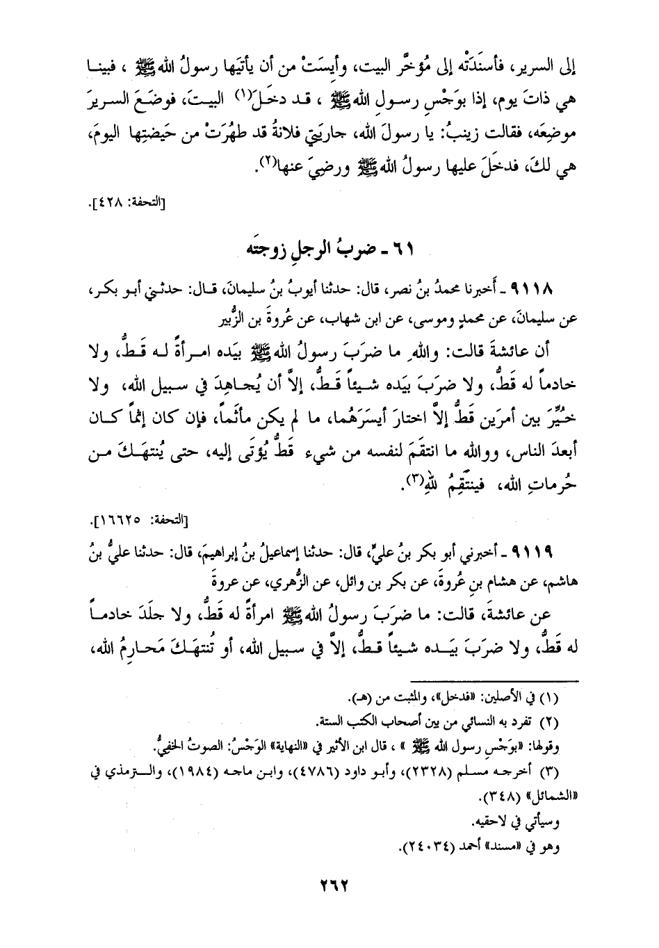 9119 - أَخْبَرَنِي أَبُو بَكْرِ بْنُ عَلِيٍّ قَالَ: حَدَّثَنَا إِسْمَاعِيلُ بْنُ إِبْرَاهِيمَ قَالَ: حَدَّثَنَا عَلِيُّ بْنُ هَاشِمٍ، عَنْ هِشَامِ بْنِ عُرْوَةَ، عَنْ بَكْرِ بْنِ وَائِلٍ، عَنِ الزُّهْرِيِّ، عَنْ عُرْوَةَ، عَنْ عَائِشَةَ قَالَتْ: «§مَا ضَرَبَ رَسُولُ اللهِ صَلَّى اللهُ عَلَيْهِ وَسَلَّمَ امْرَأَةً لَهُ قَطُّ، وَلَا جَلَدَ خَادِمًا لَهُ قَطُّ، وَلَا ضَرَبَ بِيَدِهِ شَيْئًا قَطُّ إِلَّا فِي سَبِيلِ اللهِ، أَوْ تُنْتَهَكُ مَحَارِمُ اللهِ فَيَنْتَقِمُ لِلَّهِ»