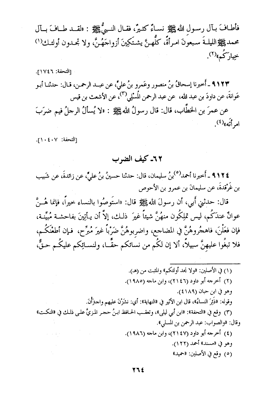 9124 - أَخْبَرَنَا أَحْمَدُ بْنُ سُلَيْمَانَ قَالَ: حَدَّثَنَا حُسَيْنُ بْنُ عَلِيٍّ، عَنْ زَائِدَةَ، عَنْ شَبِيبِ بْنِ غَرْقَدَةَ، عَنْ سُلَيْمَانَ بْنِ عَمْرِو بْنِ الْأَحْوَصِ قَالَ: حَدَّثَنِي أَبِي أَنَّ رَسُولَ اللهِ صَلَّى اللهُ عَلَيْهِ وَسَلَّمَ قَالَ: " §اسْتَوْصُوا بِالنِّسَاءِ خَيْرًا، فَإِنَّمَا هُنَّ عَوَانٌ عِنْدَكُمْ، لَيْسَ تَمْلِكُونَ مِنْهُنَّ شَيْئًا غَيْرَ ذَلِكَ {إِلَّا أَنْ يَأْتِينَ بِفَاحِشَةٍ مُبَيِّنَةٍ} [النساء: 19] فَإِنْ فَعَلْنَ فَاهْجُرُوهُنَّ فِي الْمَضَاجِعِ، وَاضْرِبُوهُنَّ ضَرْبًا غَيْرَ مُبَرِّحٍ، فَإِنْ أَطَعْنَكُمْ فَلَا تَبْغُوا عَلَيْهِنَّ سَبِيلًا إِلَّا إِنَّ لَكُمْ مِنْ نِسَائِكُمْ حَقًّا، وَلِنِسَائِكُمْ عَلَيْكُمْ حَقٌّ، فَأَمَّا حَقُّكُمْ عَلَى نِسَائِكُمْ، فَلَا يُوطِئْنَ فُرُشَكُمْ مَنْ تَكْرَهُونَ، وَلَا يَأْذَنَّ فِي بُيُوتِكُمْ لِمَنْ تَكْرَهُونَ، أَلَا وَحَقُّهُنَّ عَلَيْكُمْ أَنْ تُحْسِنُوا إِلَيْهِنَّ فِي كِسْوَتِهِنَّ، وَطَعَامِهِنَّ "