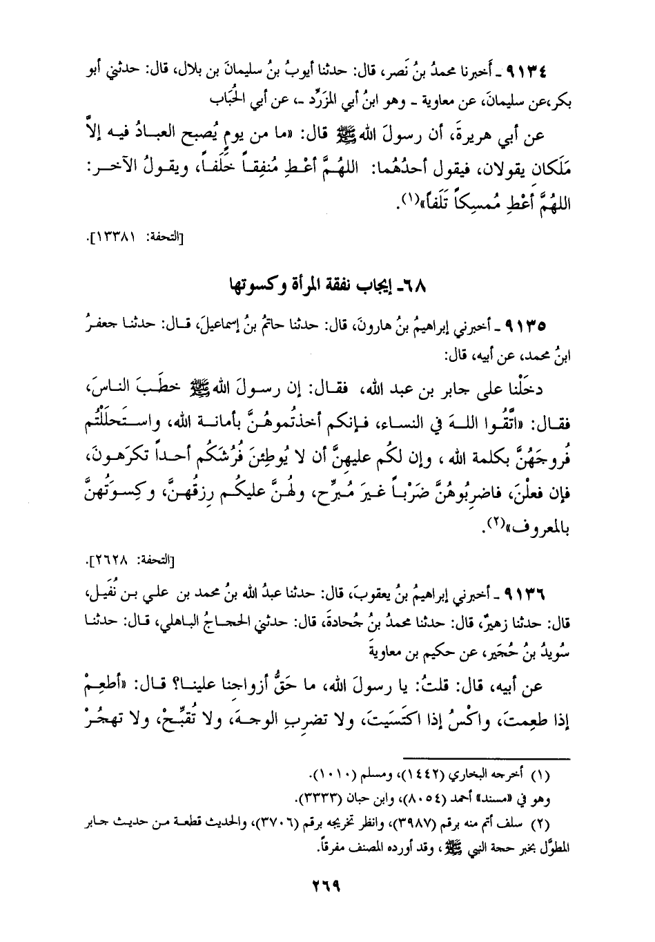 9134 - أَخْبَرَنَا مُحَمَّدُ بْنُ نَصْرٍ قَالَ: حَدَّثَنَا أَيُّوبُ بْنُ سُلَيْمَانَ بْنِ بِلَالٍ قَالَ: حَدَّثَنِي أَبُو بَكْرٍ، عَنْ سُلَيْمَانَ، عَنْ مُعَاوِيَةَ وَهُوَ ابْنُ أَبِي الْمَزْرَدِ، عَنْ أَبِي الْحُبَابٍ، عَنْ أَبِي هُرَيْرَةَ، أَنَّ رَسُولَ اللهِ صَلَّى اللهُ عَلَيْهِ وَسَلَّمَ قَالَ: §مَا مِنْ يَوْمٍ يُصْبِحُ الْعِبَادُ فِيهِ إِلَّا مَلَكَانِ يَقُولَانِ فَيَقُولُ: «أَحَدُهُمَا اللهُمَّ أَعْطِ مُنْفِقًا خَلَفًا» وَيَقُولُ الْآخِرُ: «اللهُمَّ أَعْطِ مُمْسِكًا تَلَفًا»