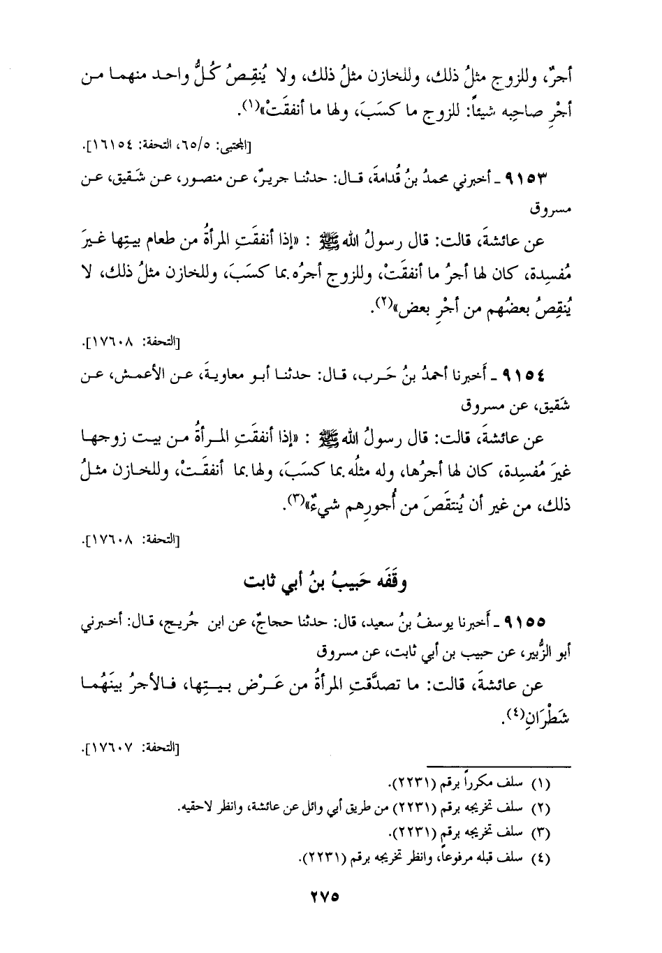 9154 - أَخْبَرَنَا أَحْمَدُ بْنُ حَرْبٍ قَالَ: حَدَّثَنَا أَبُو مُعَاوِيَةَ، عَنِ الْأَعْمَشِ، عَنْ شَقِيقٍ، عَنْ مَسْرُوقٍ، عَنْ عَائِشَةَ قَالَتْ: قَالَ رَسُولُ اللهِ صَلَّى اللهُ عَلَيْهِ وَسَلَّمَ: «§إِذَا أَنْفَقَتِ الْمَرْأَةُ مِنْ بَيْتِ زَوْجِهَا غَيْرَ مُفْسِدَةٍ كَانَ لَهَا أَجْرُهَا، وَلَهُ مِثْلُهُ بِمَا كَسَبَ وَلَهَا بِمَا أَنْفَقَتْ، وَلِلْخَازِنِ مِثْلُ ذَلِكَ مِنْ غَيْرِ أَنْ يُنْتَقَصَ مِنْ أُجُورِهِمْ شَيْءٌ» وَقَفَهُ حَبِيبُ بْنُ أَبِي ثَابِتٍ