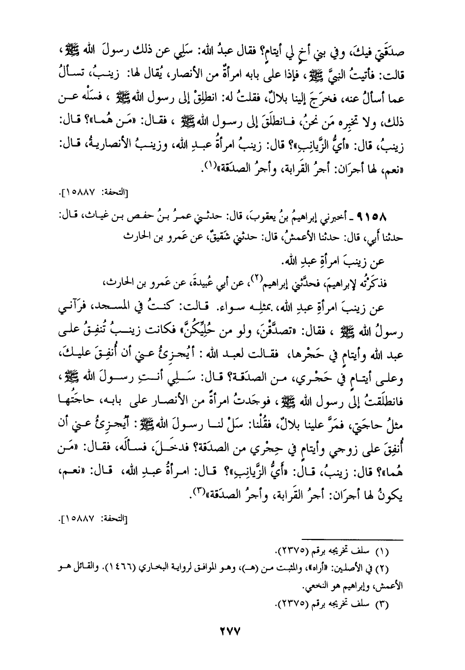 9158 - أَخْبَرَنِي إِبْرَاهِيمُ بْنُ يَعْقُوبَ قَالَ: حَدَّثَنِي عُمَرُ بْنُ حَفْصِ بْنِ غِيَاثٍ قَالَ: حَدَّثَنَا أَبِي قَالَ: حَدَّثَنَا الْأَعْمَشُ قَالَ: حَدَّثَنِي شَقِيقٌ، عَنْ عَمْرِو بْنِ الْحَارِثِ، عَنْ زَيْنَبَ امْرَأَةِ عَبْدِ اللهِ فَذَكَرَتْهُ لِإِبْرَاهِيمَ فَحَدَّثَنِي إِبْرَاهِيمُ عَنْ أَبِي عُبَيْدَةَ، عَنْ عَمْرِو بْنِ الْحَارِثِ، عَنْ زَيْنَبَ امْرَأَةِ عَبْدِ اللهِ بِمِثْلِهِ سَوَاءً قَالَتْ: كُنْتُ فِي الْمَسْجِدِ فَرَآنِي رَسُولُ اللهِ صَلَّى اللهُ عَلَيْهِ وَسَلَّمَ، فَقَالَ: «§تَصَدَّقْنَ وَلَوْ مِنْ حُلِيِّكُنَّ» فَكَانَتْ زَيْنَبُ تُنْفِقُ عَلَى عَبْدِ اللهِ وَأَيْتَامٍ فِي حَجْرِهَا " فَقَالَتْ لِعَبْدِ اللهِ: «أَيُجْزِئُ عَنِّي أَنْ أَنْفَقَ عَلَيْكَ وَعَلَى أَيْتَامٍ فِي حَجْرِي مِنَ الصَّدَقَةِ؟» قَالَ: سَلِي أَنْتِ رَسُولَ اللهِ صَلَّى اللهُ عَلَيْهِ وَسَلَّمَ، فَانْطَلَقْتُ إِلَى رَسُولِ اللهِ صَلَّى اللهُ عَلَيْهِ وَسَلَّمَ فَوَجَدْتُ امْرَأَةً مِنَ الْأَنْصَارِ عَلَى بَابِهِ، حَاجَتُهَا مِثْلُ حَاجَتِي، فَمَرَّ عَلَيْنَا بِلَالٌ فَقُلْنَا: «سَلْ لَنَا رَسُولَ اللهِ صَلَّى اللهُ عَلَيْهِ وَسَلَّمَ، أَيُجْزِئُ عَنِّي أَنْ أُنْفِقَ عَلَى زَوْجِي وَأَيْتَامٍ فِي حَجْرِي مِنَ الصَّدَقَةِ؟ فَدَخَلَ فَسَأَلَهُ» فَقَالَ: «مَنْ هُمَا؟» قَالَ زَيْنَبُ: قَالَ: «أَيُّ الزَّيَانِبِ؟» قَالَ: امْرَأَةُ عَبْدِ اللهِ قَالَ: «نَعَمْ، يَكُونُ لَهَا أَجْرَانِ، أَجْرُ الْقَرَابَةِ، وَأَجْرُ الصَّدَقَةِ»