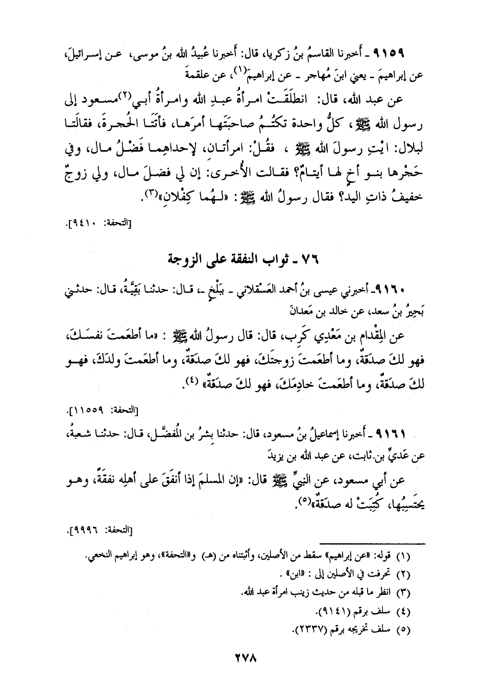 9159 - أَخْبَرَنَا الْقَاسِمُ بْنُ زَكَرِيَّا قَالَ: أَخْبَرَنَا عُبَيْدُ اللهِ بْنُ مُوسَى، عَنْ إِسْرَائِيلَ، عَنْ إِبْرَاهِيمَ يَعْنِي ابْنَ مُهَاجِرٍ، عَنْ إِبْرَاهِيمَ، عَنْ عَلْقَمَةَ، عَنْ عَبْدِ اللهِ قَالَ: §انْطَلَقَتِ امْرَأَةُ عَبْدِ اللهِ، وَامْرَأَةُ أَبِي مَسْعُودٍ إِلَى رَسُولِ اللهِ صَلَّى اللهُ عَلَيْهِ وَسَلَّمَ، كُلُّ وَاحِدَةٍ تَكْتُمْ صَاحِبَتَهَا أَمْرَهَا، فَأَتَتَا الْحُجْرَةَ، فَقَالَتَا لِبِلَالٍ: ايتِ رَسُولَ اللهِ صَلَّى اللهُ عَلَيْهِ وَسَلَّمَ فَقُلِ: «امْرَأَتَانِ، لِإِحْدَاهُمَا فَضْلُ مَالٍ، وَفِي حَجْرِهَا بَنُو أَخٍ لَهَا أَيْتَامٌ» فَقَالَتِ الْأُخْرَى: إِنَّ لِي فَضْلَ مَالٍ وَلِي زَوْجٌ خَفِيفُ ذَاتِ الْيَدِ فَقَالَ رَسُولُ اللهِ صَلَّى اللهُ عَلَيْهِ وَسَلَّمَ: «لَهُمَا كِفْلَانِ»