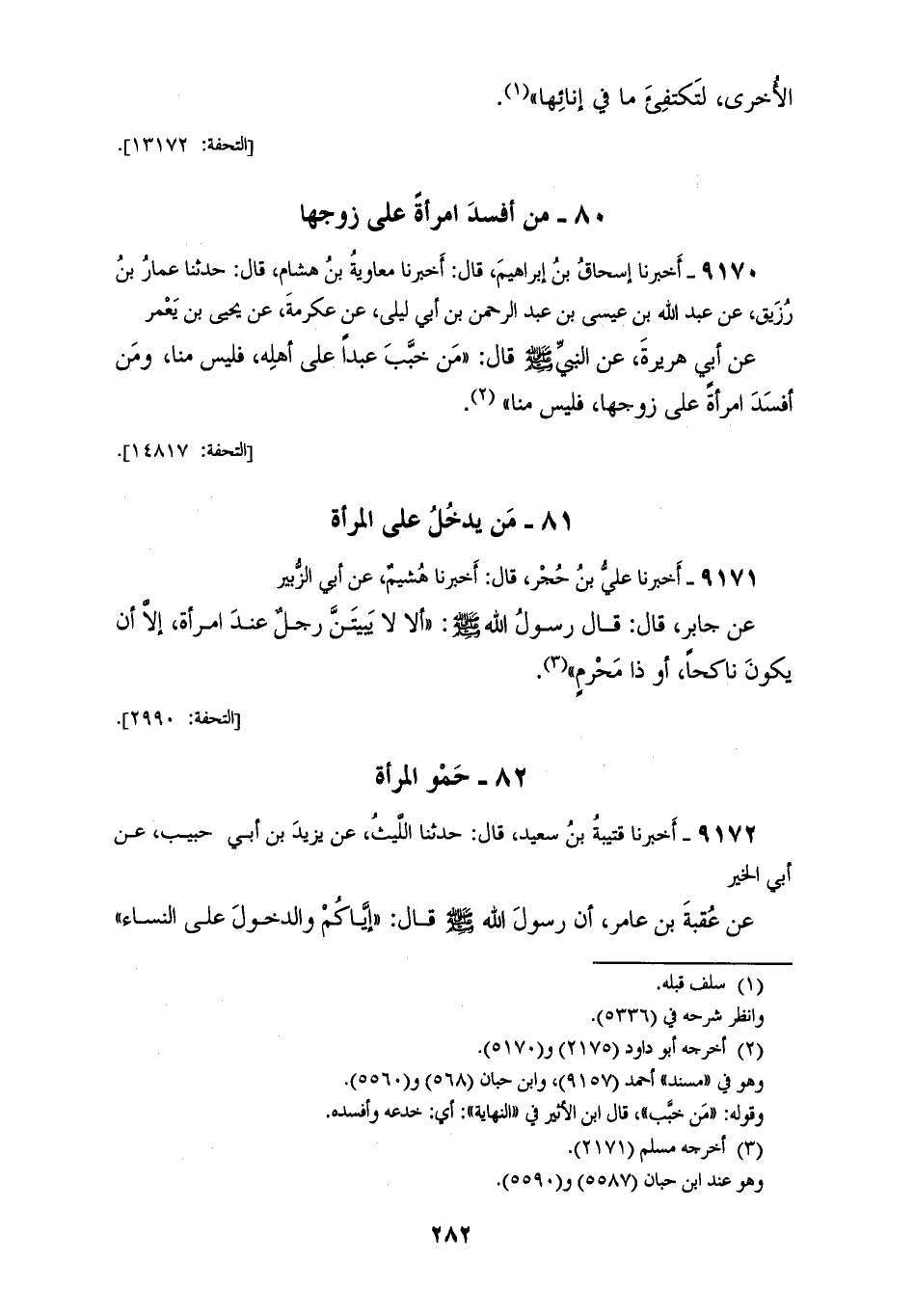 9171 - أَخْبَرَنَا عَلِيُّ بْنُ حُجْرٍ قَالَ: أَخْبَرَنَا هُشَيْمٌ، عَنْ أَبِي الزُّبَيْرِ، عَنْ جَابِرٍ قَالَ: قَالَ رَسُولُ اللهِ صَلَّى اللهُ عَلَيْهِ وَسَلَّمَ: «§أَلَا لَا يَبِيتَنَّ رَجُلٌ عِنْدَ امْرَأَةٍ إِلَّا أَنْ يَكُونَ نَاكِحًا، أَوْ ذَا مَحْرَمٍ»