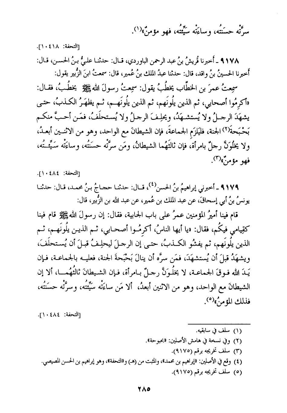 9179 - أَخْبَرَنِي إِبْرَاهِيمُ بْنُ الْحَسَنِ قَالَ: حَدَّثَنَا حَجَّاجُ بْنُ مُحَمَّدٍ قَالَ: حَدَّثَنَا يُونُسُ بْنُ أَبِي إِسْحَاقَ عَنْ عَبْدِ الْمَلِكِ بْنِ عُمَيْرٍ، عَنْ عَبْدِ اللهِ بْنِ الزُّبَيْرِ قَالَ: قَامَ فِينَا أَمِيرُ الْمُؤْمِنِينَ عُمَرُ عَلَى بَابِ الْجَابِيَةِ، فَقَالَ: إِنَّ رَسُولَ اللهِ صَلَّى اللهُ عَلَيْهِ وَسَلَّمَ قَامَ فِينَا كَقِيَامِي فِيكُمْ فَقَالَ: §يَا أَيُّهَا النَّاسُ «أَكْرِمُوا أَصْحَابِي، ثُمَّ الَّذِينَ يَلُونَهُمْ، ثُمَّ الَّذِينَ يَلُونَهُمْ، ثُمَّ يَفْشُو الْكَذِبُ حَتَّى إِنَّ الرَّجُلَ لِيَحْلِفَ قَبْلَ أَنْ يُسْتَحْلَفَ، وَيَشْهَدَ قَبْلَ أَنْ يُسْتَشْهَدَ، فَمَنْ سَرَّهُ أَنْ يَنَالَ بُحْبُحَةَ الْجَنَّةٍ فَعَلَيْهِ بِالْجَمَاعَةِ، فَإِنَّ يَدَ اللهِ فَوْقَ الْجَمَاعَةِ، لَا يَخْلُوَنَّ رَجُلٌ بِامْرَأَةٍ، فَإِنَّ الشَّيْطَانَ ثَالِثُهُمَا أَلَا إِنَّ الشَّيْطَانَ مَعَ الْوَاحِدِ، وَهُوَ مِنَ الِاثْنَيْنِ أَبَعْدُ، أَلَا مَنْ سَاءَتْهُ سَيِّئَتُهُ وَسَرَّتْهُ حَسَنَتُهُ فَذَلِكَ الْمُؤْمِنُ»