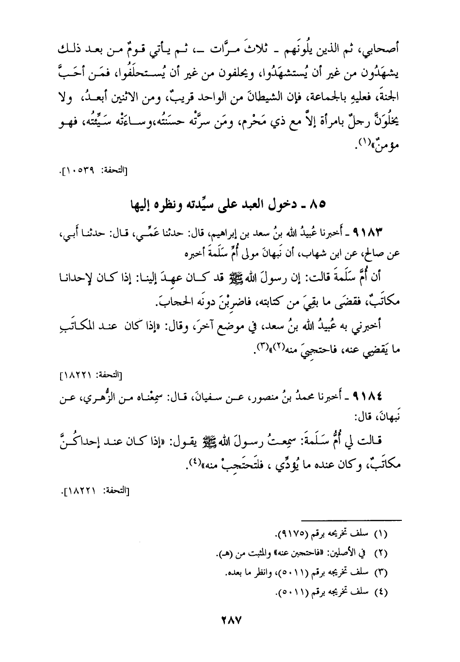 9184 - أَخْبَرَنَا مُحَمَّدُ بْنُ مَنْصُورٍ، عَنْ سُفْيَانَ قَالَ: سَمِعْنَاهُ مِنَ الزُّهْرِيِّ، عَنْ نَبْهَانَ قَالَ: قَالَتْ لِي أُمُّ سَلَمَةَ سَمِعْتُ رَسُولَ اللهِ صَلَّى اللهُ عَلَيْهِ وَسَلَّمَ يَقُولُ: «§إِذَا كَانَ عِنْدَ إِحْدَاكُنَّ مُكَاتَبٌ، وَكَانَ عِنْدَهُ مَا يُؤَدِّي فَلْتَحْتَجِبْ مِنْهُ»