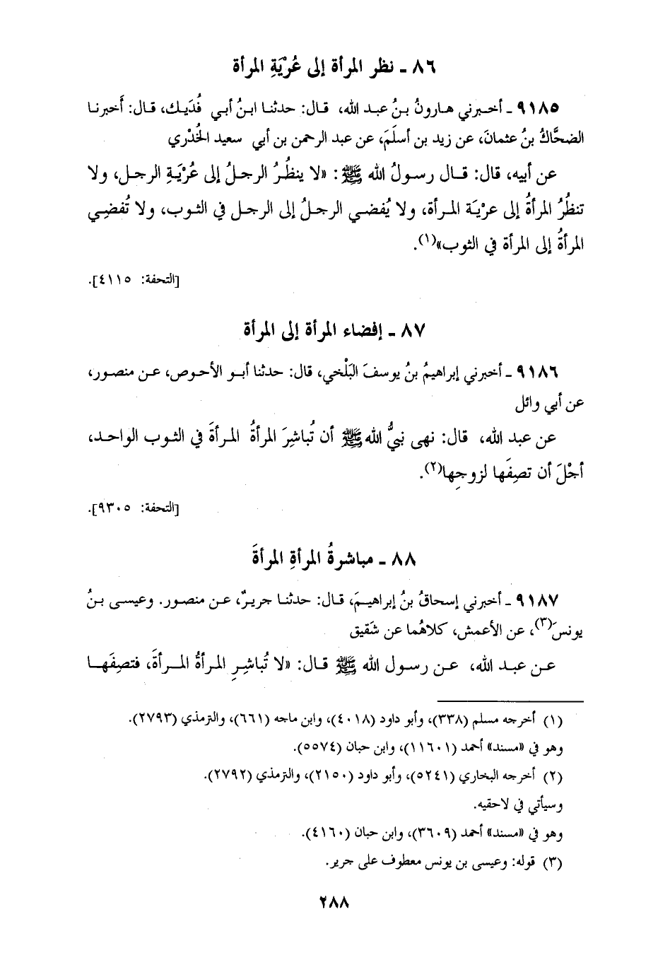 9187 - أَخْبَرَنِي إِسْحَاقُ بْنُ إِبْرَاهِيمَ قَالَ: حَدَّثَنَا جَرِيرٌ، عَنْ مَنْصُورٍ، وَعِيسَى بْنُ يُونُسَ، عَنِ الْأَعْمَشِ، كِلَاهُمَا عَنْ شَقِيقٍ، عَنْ عَبْدِ اللهِ، عَنْ رَسُولِ اللهِ صَلَّى اللهُ عَلَيْهِ وَسَلَّمَ قَالَ: «§لَا تُبَاشِرِ الْمَرْأَةُ الْمَرْأَةَ فَتَصِفَهَا لِزَوْجِهَا كَأَنَّهُ يَنْظُرُ إِلَيْهَا»
