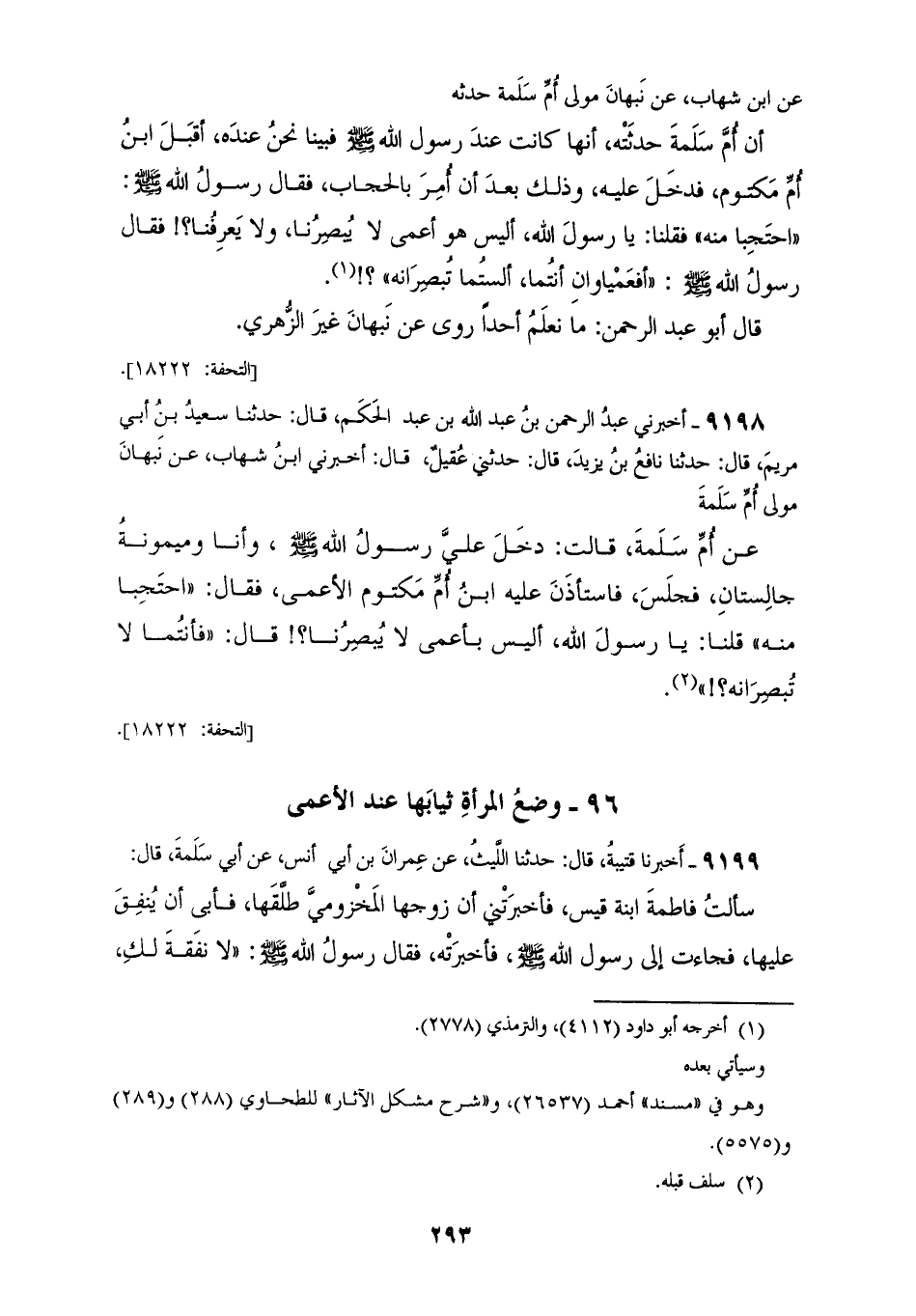 9198 - أَخْبَرَنِي عَبْدُ الرَّحْمَنِ بْنُ عَبْدِ اللهِ بْنِ عَبْدِ الْحَكَمِ قَالَ: حَدَّثَنَا سَعِيدُ بْنُ أَبِي مَرْيَمَ قَالَ: حَدَّثَنَا نَافِعُ بْنُ يَزِيدَ قَالَ: حَدَّثَنِي عُقَيْلٌ قَالَ: أَخْبَرَنِي ابْنُ شِهَابٍ، عَنْ نَبْهَانَ، مَوْلَى أُمِّ سَلَمَةَ عَنْ أُمِّ سَلَمَةَ قَالَتْ: دَخَلَ عَلَيَّ رَسُولُ اللهِ صَلَّى اللهُ عَلَيْهِ وَسَلَّمَ وَأنا وَمَيْمُونَةُ جَالِسَتَانِ فَجَلَسَ فَاسْتَأْذَنَ عَلَيْهِ ابْنُ أُمِّ مَكْتُومٍ الْأَعْمَى فَقَالَ: «§احْتَجِبَا مِنْهُ» قُلْنَا: يَا رَسُولَ اللهِ أَلَيْسَ بِأَعْمَى لَا يُبْصِرُنَا قَالَ: «فَأَنْتُمَا لَا تُبْصِرَانِهِ؟»