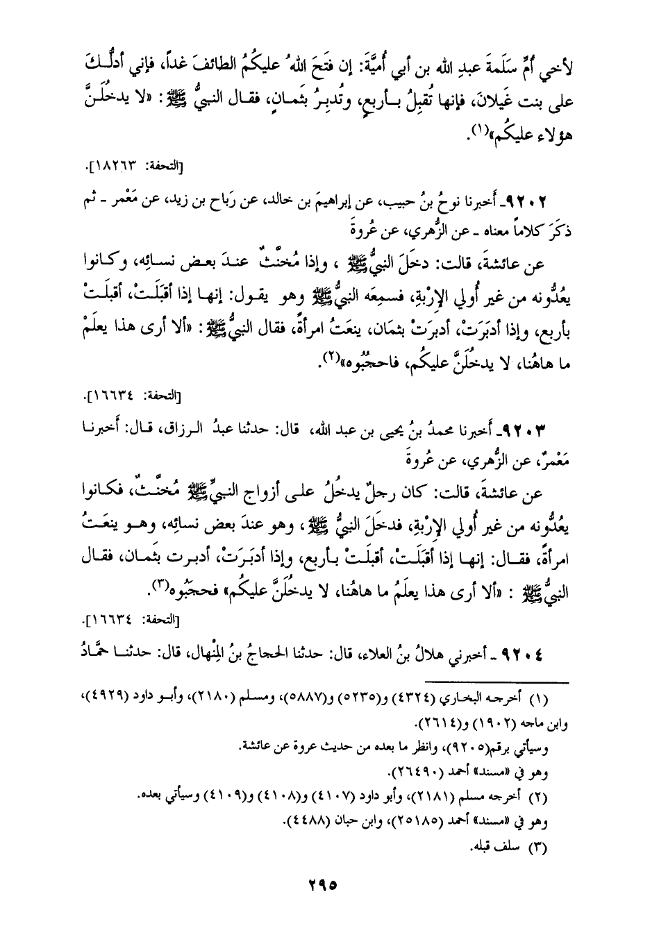 9202 - أَخْبَرَنَا نُوحُ بْنُ حَبِيبٍ، عَنْ إِبْرَاهِيمَ بْنِ خَالِدٍ، عَنْ رَبَاحِ بْنِ زَيْدٍ، عَنْ مَعْمَرٍ، ثُمَّ ذَكَرَ كَلَامًا مَعْنَاهُ عَنِ الزُّهْرِيِّ، عَنْ عُرْوَةَ، عَنْ عَائِشَةَ قَالَتْ: §دَخَلَ النَّبِيُّ صَلَّى اللهُ عَلَيْهِ وَسَلَّمَ، وَإِذَا مُخَنَّثٌ عِنْدَ بَعْضِ نِسَائِهِ وَكَانُوا يَعُدُّونَهُ مِنْ غَيْرِ أُولِي الْإِرْبَةِ فَسَمِعَهُ النَّبِيُّ صَلَّى اللهُ عَلَيْهِ وَسَلَّمَ وَهُوَ يَقُولُ: إِنَّهَا إِذَا أَقْبَلَتْ أَقْبَلَتْ بِأَرْبَعٍ، وَإِذَا أَدْبَرَتْ أَدْبَرَتْ بِثَمَانٍ يَنْعَتُ امْرَأَةً فَقَالَ النَّبِيُّ صَلَّى اللهُ عَلَيْهِ وَسَلَّمَ: «أَلَا أَرَى هَذَا يَعْلَمُ مَا هَاهُنَا لَا يَدْخُلَنَّ عَلَيْكُمْ فَاحْجُبُوهُ»