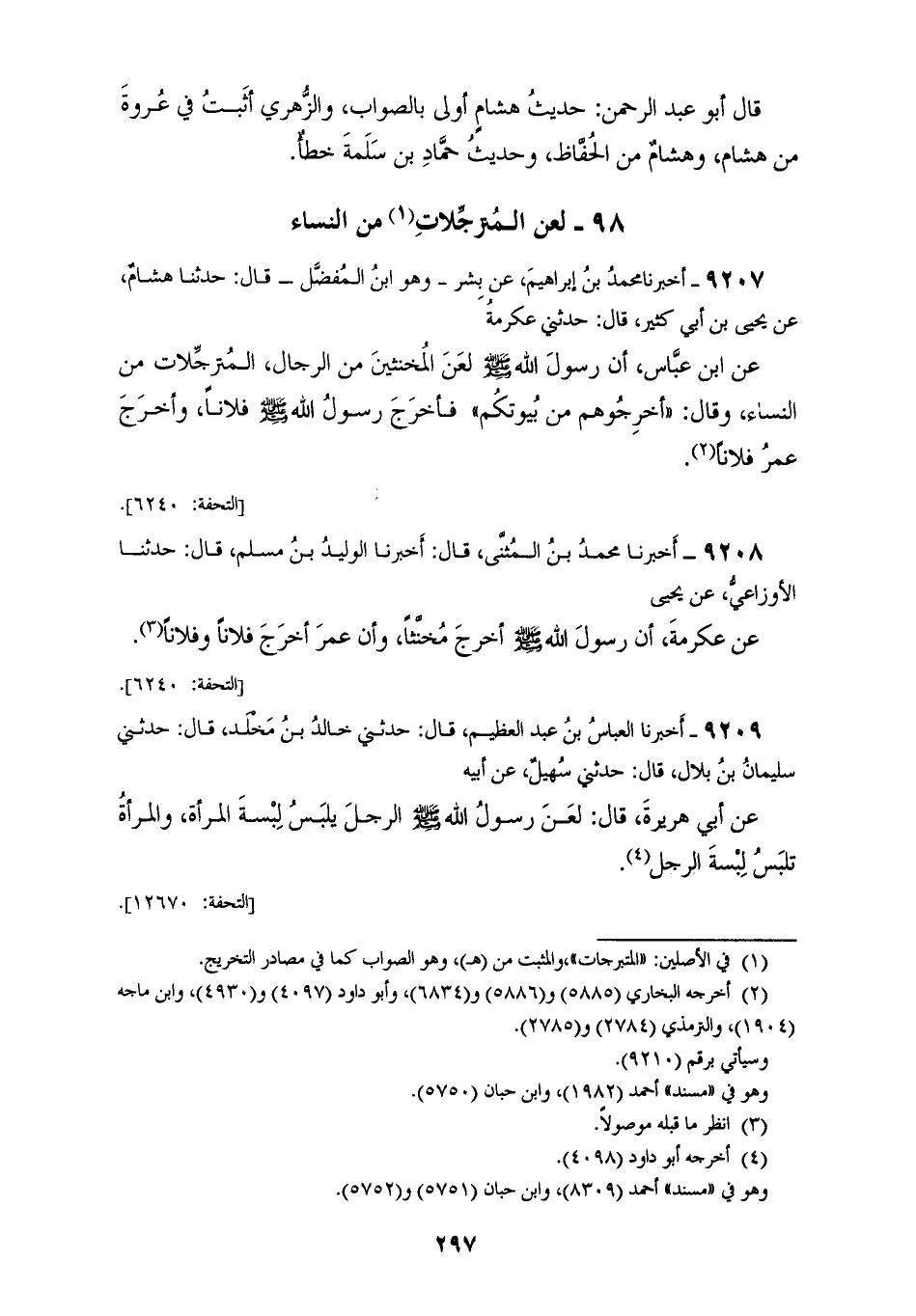 9207 - أَخْبَرَنَا مُحَمَّدُ بْنُ إِبْرَاهِيمَ، عَنْ بِشْرٍ وَهُوَ ابْنُ الْمُفَضَّلِ قَالَ: حَدَّثَنَا هِشَامٌ، عَنْ يَحْيَى بْنِ أَبِي كَثِيرٍ قَالَ: حَدَّثَنِي عِكْرِمَةُ، عَنِ ابْنِ عَبَّاسٍ، أَنَّ رَسُولَ اللهِ صَلَّى اللهُ عَلَيْهِ وَسَلَّمَ «§لَعَنَ الْمُخَنَّثِينَ مِنَ الرِّجَالِ، الْمُتَرَجِّلَاتِ مِنَ النِّسَاءِ» وَقَالَ: «أَخْرِجُوهُمْ مِنْ بُيُوتِكُمْ» فَأَخْرَجَ رَسُولُ اللهِ صَلَّى اللهُ عَلَيْهِ وَسَلَّمَ فُلَانًا، وَأَخْرَجَ عُمَرُ فُلَانًا "