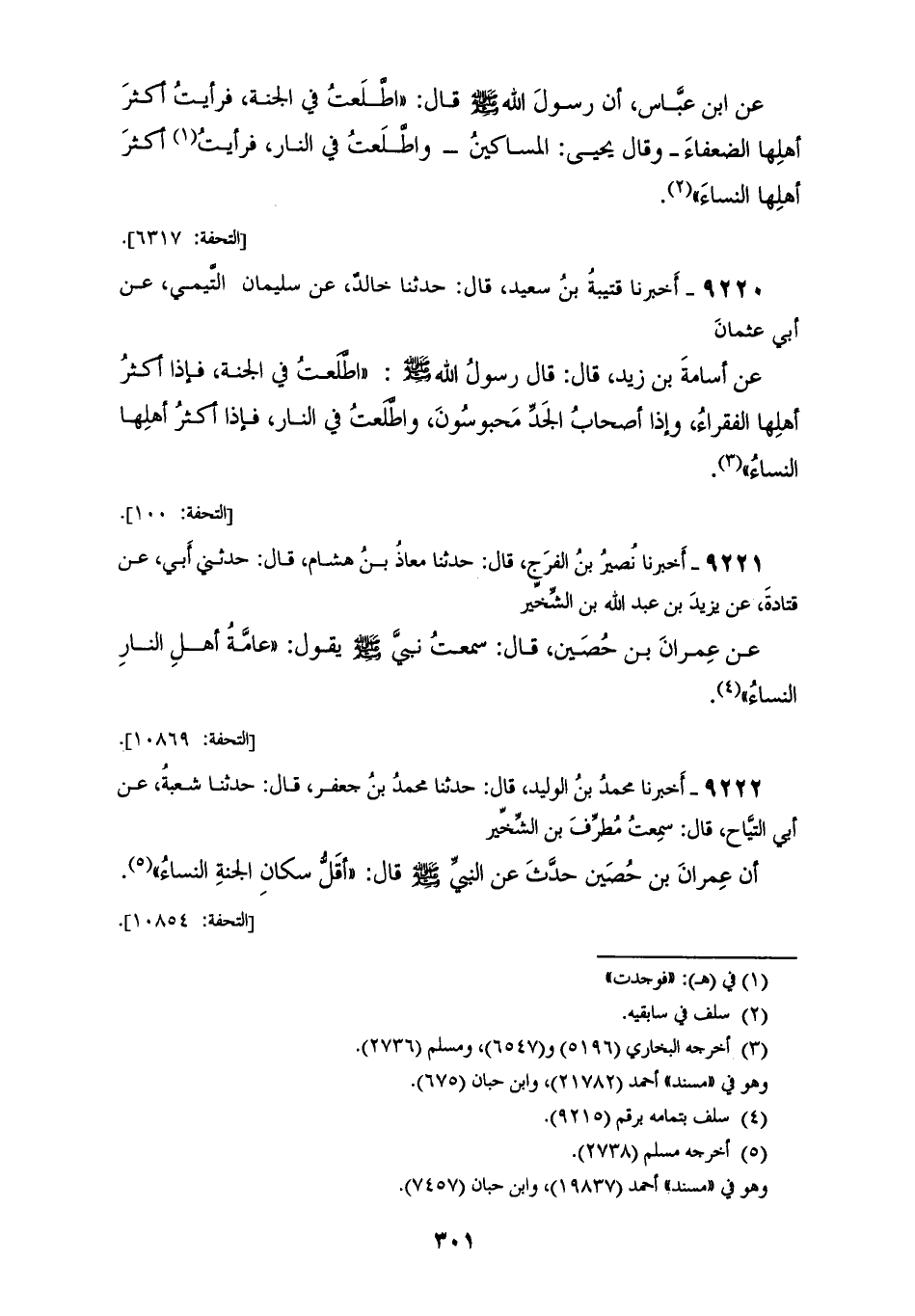 9220 - أَخْبَرَنَا قُتَيْبَةُ بْنُ سَعِيدٍ قَالَ: حَدَّثَنَا خَالِدٌ، عَنْ سُلَيْمَانَ التَّيْمِيِّ، عَنْ أَبِي عُثْمَانَ، عَنْ أُسَامَةَ بْنِ زَيْدٍ قَالَ: قَالَ رَسُولُ اللهِ صَلَّى اللهُ عَلَيْهِ وَسَلَّمَ: «§اطَّلَعْتُ فِي الْجَنَّةِ فَإِذَا أَكْثَرُ أَهْلِهَا الْفُقَرَاءَ، وَإِذَا أَصْحَابُ الْجَدِّ مَحْبُوسُونَ، وَاطَّلَعْتُ فِي النَّارِ فَإِذَا أَكْثَرُ أَهْلِهَا النِّسَاءُ»