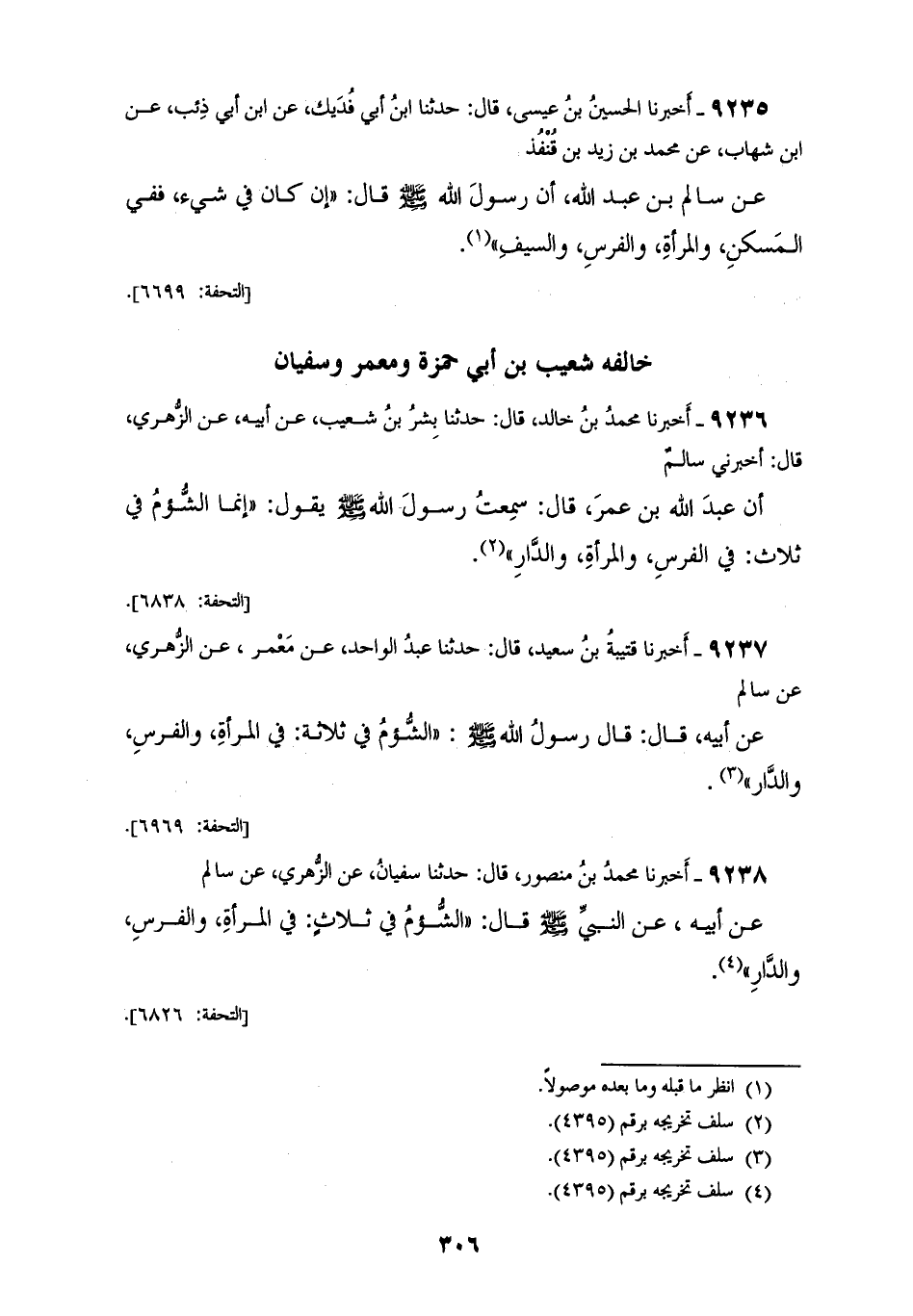 9235 - أَخْبَرَنَا الْحُسَيْنُ بْنُ عِيسَى قَالَ: حَدَّثَنَا ابْنُ أَبِي فُدَيْكٍ، عَنِ ابْنِ أَبِي ذِئْبٍ، عَنِ ابْنِ شِهَابٍ، عَنْ مُحَمَّدِ بْنِ زَيْدِ بْنِ قُنْفُذٍ، عَنْ سَالِمِ بْنِ عَبْدِ اللهِ، أَنَّ رَسُولَ اللهِ صَلَّى اللهُ عَلَيْهِ وَسَلَّمَ قَالَ: «§إِنْ كَانَ فِي شَيْءٍ فَفِي الْمَسْكَنِ، وَالْمَرْأَةِ، وَالْفَرَسِ، وَالسَّيْفِ» خَالَفَهُ شُعَيْبُ بْنُ أَبِي حَمْزَةَ، وَمَعْمَرٌ، وَسُفْيَانُ