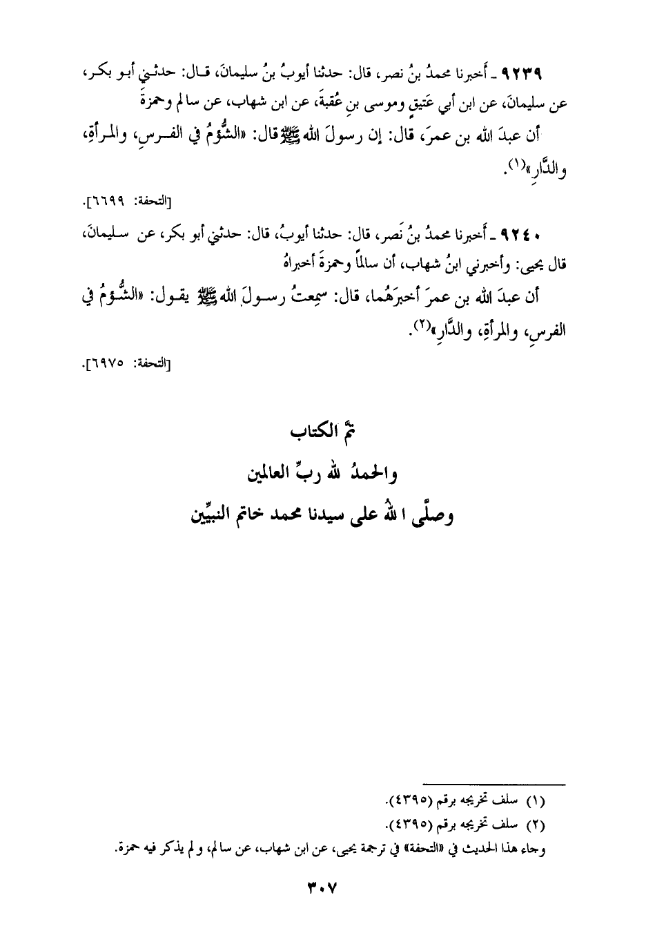 9240 - أَخْبَرَنَا مُحَمَّدُ بْنُ نَصْرٍ قَالَ: حَدَّثَنَا أَيُّوبُ قَالَ: حَدَّثَنِي أَبُو بَكْرٍ، عَنْ سُلَيْمَانَ قَالَ: يَحْيَى وَأَخْبَرَنِي ابْنُ شِهَابٍ، أَنَّ سَالِمًا، وَحَمْزَةَ، أَخْبَرَاهُ أَنَّ عَبْدَ اللهِ بْنَ عُمَرَ أَخْبَرَهُمَا قَالَ: سَمِعْتُ رَسُولَ اللهِ صَلَّى اللهُ عَلَيْهِ وَسَلَّمَ يَقُولُ: «§الشُّؤْمُ فِي الْفَرَسِ، وَالْمَرْأَةِ، وَالدَّارِ»