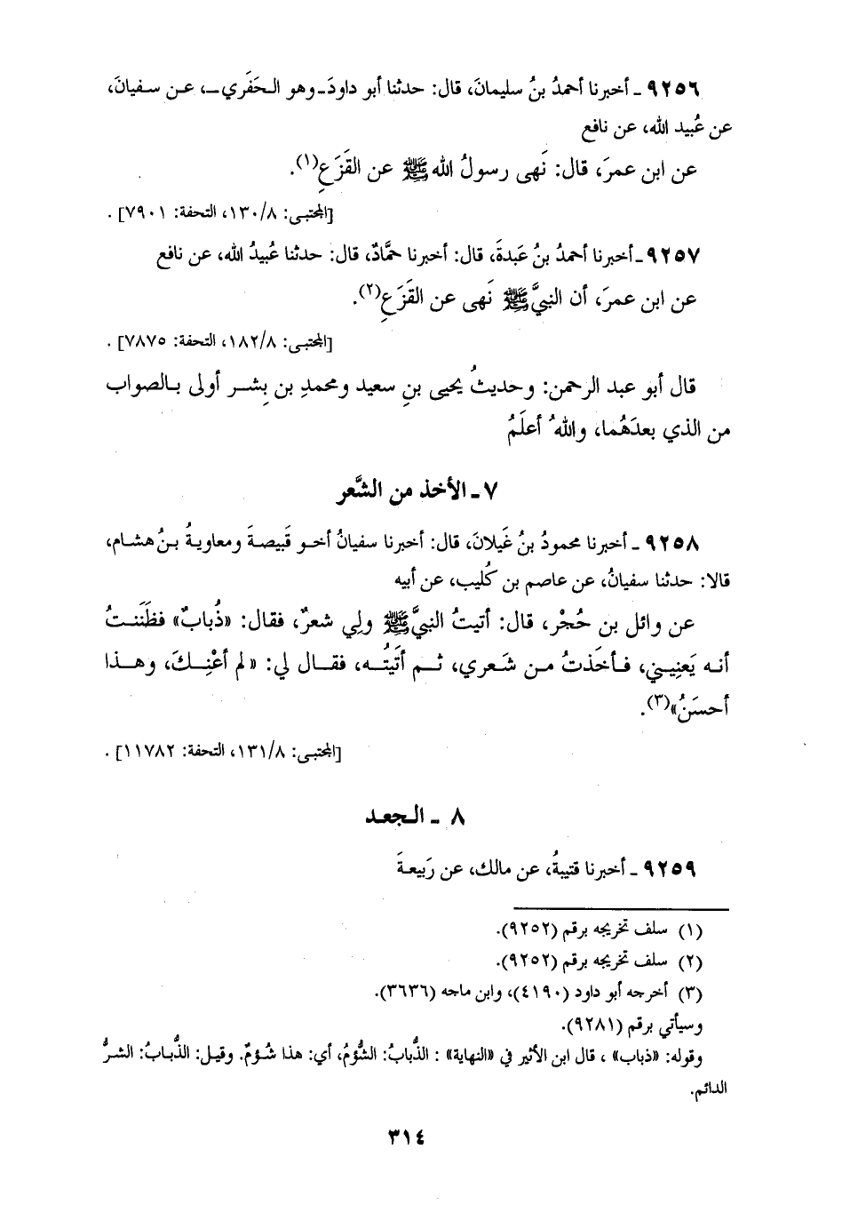9257 - أَخْبَرَنَا أَحْمَدُ بْنُ عَبْدَةَ قَالَ: أَخْبَرَنَا حَمَّادٌ قَالَ: حَدَّثَنَا عُبَيْدُ اللهِ، عَنْ نَافِعٍ، عَنِ ابْنِ عُمَرَ، أَنَّ النَّبِيَّ صَلَّى اللهُ عَلَيْهِ وَسَلَّمَ «§نَهَى عَنِ الْقَزَعِ» قَالَ أَبُو عَبْدِ الرَّحْمَنِ: وَحَدِيثُ يَحْيَى بْنِ سَعِيدٍ، وَمُحَمَّدِ بْنِ بِشْرٍ أَوْلَى بِالصَّوَابِ مِنَ الَّذِي بَعْدَهُمَا، وَاللهُ أَعْلَمُ