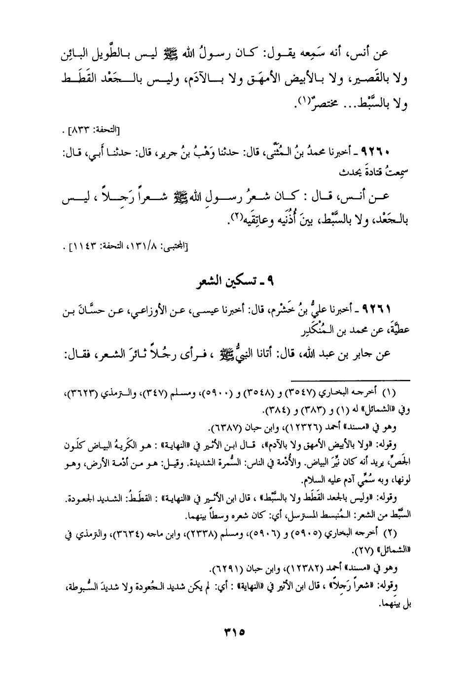 9260 - أَخْبَرَنَا مُحَمَّدُ بْنُ الْمُثَنَّى قَالَ: حَدَّثَنَا وَهْبُ بْنُ جَرِيرٍ قَالَ: حَدَّثَنَا أَبِي قَالَ: سَمِعْتُ قَتَادَةَ، يُحَدِّثُ عَنْ أَنَسٍ قَالَ: «§كَانَ شَعْرُ رَسُولِ اللهِ صَلَّى اللهُ عَلَيْهِ وَسَلَّمَ شَعْرًا رَجُلًا لَيْسَ بِالْجَعْدِ، وَلَا بِالسَّبْطِ، بَيْنَ أُذُنَيْهِ وَعَاتِقَيْهِ»