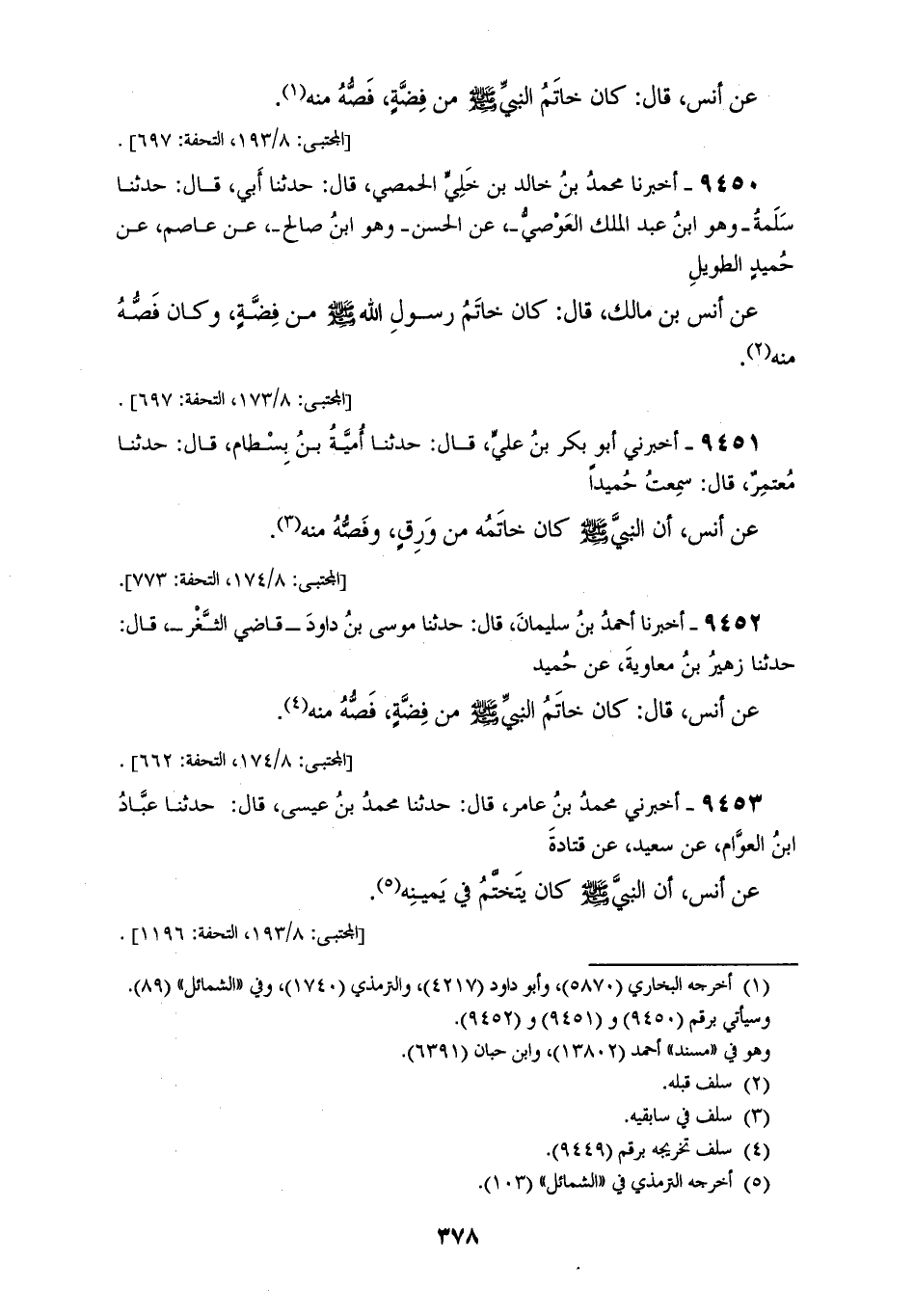 9453 - أَخْبَرَنِي مُحَمَّدُ بْنُ عَامِرٍ، قَالَ: حَدَّثَنَا مُحَمَّدُ بْنُ عِيسَى، قَالَ: حَدَّثَنَا عَبَّادُ بْنُ الْعَوَّامِ، عَنْ سَعِيدٍ، عَنْ قَتَادَةَ، عَنْ أَنَسٍ، «§أَنَّ النَّبِيَّ صَلَّى اللهُ عَلَيْهِ وَسَلَّمَ كَانَ يَتَخَتَّمُ فِي يَمِينِهِ»