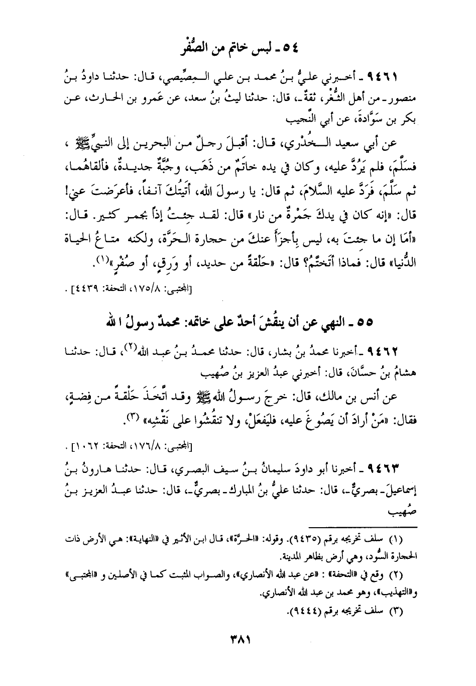 9461 - أَخْبَرَنِي عَلِيُّ بْنُ مُحَمَّدِ بْنِ عَلِيٍّ الْمِصِّيصِيُّ، قَالَ: حَدَّثَنَا دَاوُدُ بْنُ مَنْصُورٍ، مِنْ أَهْلِ الثَّغْرِ ثِقَةٌ، قَالَ: حَدَّثَنَا لَيْثُ بْنُ سَعْدٍ، عَنْ عَمْرِو بْنِ الْحَارِثِ، عَنْ بَكْرِ بْنِ سَوَادَةَ، عَنْ أَبِي النَّجِيبِ، عَنْ أَبِي سَعِيدٍ الْخُدْرِيِّ، قَالَ: " أَقْبَلَ رَجُلٌ مِنَ الْبَحْرَيْنِ إِلَى النَّبِيِّ صَلَّى اللهُ عَلَيْهِ وَسَلَّمَ فَسَلَّمَ فَلَمْ يَرُدَّ عَلَيْهِ، وَكَانَ فِي يَدِهِ خَاتَمٌ مِنْ ذَهَبٍ، وَجْبَةٌ جَدِيدَةٌ فَأَلْقَاهُمَا ثُمَّ سَلَّمَ، فَرَدَّ عَلَيْهِ السَّلَامَ، ثُمَّ قَالَ: يَا رَسُولَ اللهِ، أَتَيْتُكَ آنِفًا فَأَعْرَضْتَ عَنِّي، قَالَ: «§إِنَّهُ كَانَ فِي يَدِكَ جَمْرَةٌ مِنْ نَارٍ»، قَالَ: لَقَدْ جِئْتُ إِذًا بِجَمْرٍ كَثِيرٍ، قَالَ: «أَمَا إِنَّ مَا جِئْتَ بِهِ لَيْسَ بِأَجْزَأَ عَنْكَ مِنْ حِجَارَةِ الْحَرَّةِ، وَلَكِنَّهُ مَتَاعُ الْحَيَاةِ الدُّنْيَا»، قَالَ: فَمَاذَا أَتَخَتَّمُ؟، قَالَ: «حَلْقَةٌ مِنْ حَدِيدٍ، أَوْ وَرِقٍ أَوْ صُفْرٍ»