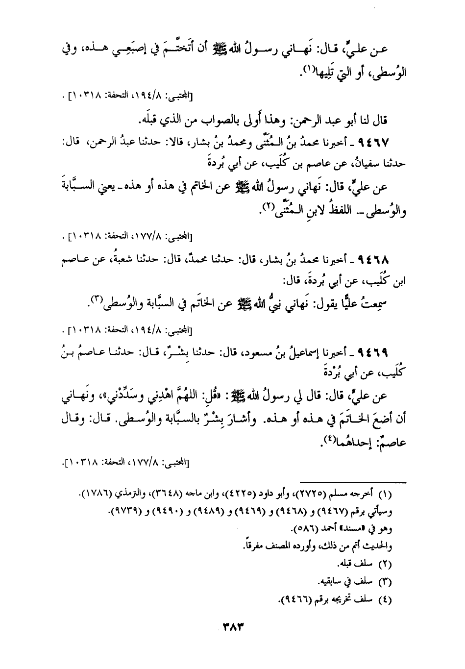9467 - أَخْبَرَنَا مُحَمَّدُ بْنُ الْمُثَنَّى، وَمُحَمَّدُ بْنُ بَشَّارٍ، قَالَا: حَدَّثَنَا عَبْدُ الرَّحْمَنِ، قَالَ: حَدَّثَنَا سُفْيَانُ، عَنْ عَاصِمِ بْنِ كُلَيْبٍ، عَنْ أَبِي بُرْدَةَ، عَنْ عَلِيٍّ، قَالَ: «§نَهَانِي رَسُولُ اللهِ صَلَّى اللهُ عَلَيْهِ وَسَلَّمَ عَنِ الْخَاتَمِ فِي هَذِهِ أَوْ هَذِهِ، يَعْنِي السَّبَّابَةَ وَالْوُسْطَى». اللَّفْظُ لِابْنِ الْمُثَنَّى