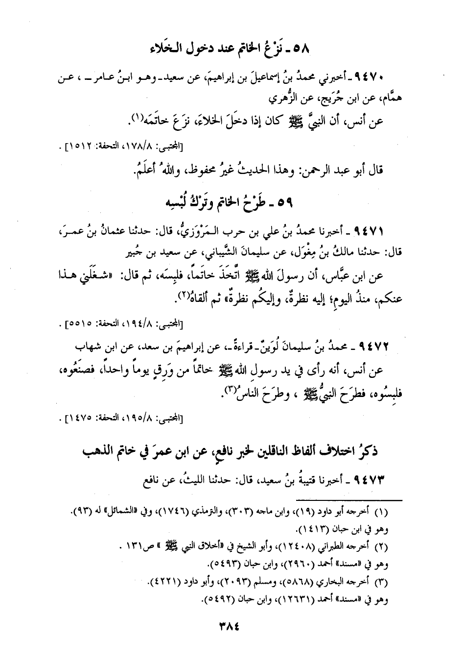 9470 - أَخْبَرَنِي مُحَمَّدُ بْنُ إِسْمَاعِيلَ بْنِ إِبْرَاهِيمَ، عَنْ سَعِيدٍ وَهُوَ ابْنُ عَامِرٍ، عَنْ هَمَّامٍ، عَنِ ابْنِ جُرَيْجٍ، عَنِ الزُّهْرِيِّ، عَنْ أَنَسٍ، «أَنَّ النَّبِيَّ صَلَّى اللهُ عَلَيْهِ وَسَلَّمَ كَانَ §إِذَا دَخَلَ الْخَلَاءَ نَزَعَ خَاتَمَهُ»، قَالَ أَبُو عَبْدِ الرَّحْمَنِ: وَهَذَا الْحَدِيثُ غَيْرُ مَحْفُوظٍ، وَاللهُ أَعْلَمُ