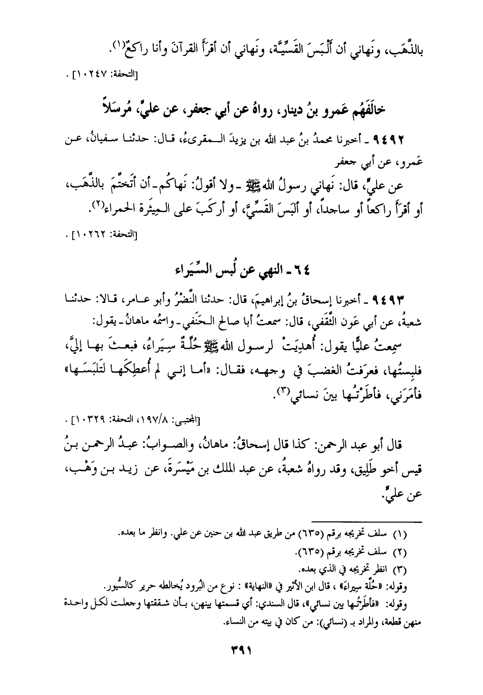 9493 - أَخْبَرَنَا إِسْحَاقُ بْنُ إِبْرَاهِيمَ، قَالَ: حَدَّثَنَا النَّضْرُ، وَأَبُو عَامِرٍ، قَالَا: حَدَّثَنَا شُعْبَةُ، عَنْ أَبِي عَوْنٍ الثَّقَفِيِّ، قَالَ: سَمِعْتُ أَبَا صَالِحٍ الْحَنَفِيَّ وَاسْمُهُ مَاهَانُ يَقُولُ: سَمِعْتُ عَلِيًّا، يَقُولُ: أَهْدَيْتُ لِرَسُولِ اللهِ صَلَّى اللهُ عَلَيْهِ وَسَلَّمَ حُلَّةً سِيَرَاءَ، فَبَعَثَ بِهَا إِلَيَّ فَلَبِسْتُهَا، فَعَرَفْتُ الْغَضَبَ فِي وَجْهِهِ، فَقَالَ: «§أَمَا إِنِّي لَمْ أُعْطِكَهَا لِتَلْبَسْهَا»، فَأَمَرَنِي فَأَطَرْتُهَا بَيْنَ نِسَائِي، قَالَ أَبُو عَبْدِ الرَّحْمَنِ: كَذَا قَالَ إِسْحَاقُ: مَاهَانُ، وَالصَّوَابُ عَبْدُ الرَّحْمَنِ بْنُ قَيْسٍ أَخُو طَلِيقٍ، وَقَدْ رَوَاهُ شُعْبَةُ عَنْ عَبْدِ الْمَلِكِ بْنِ مَيْسَرَةَ عَنْ زَيْدِ بْنِ وَهْبٍ عَنْ عَلِيٍّ