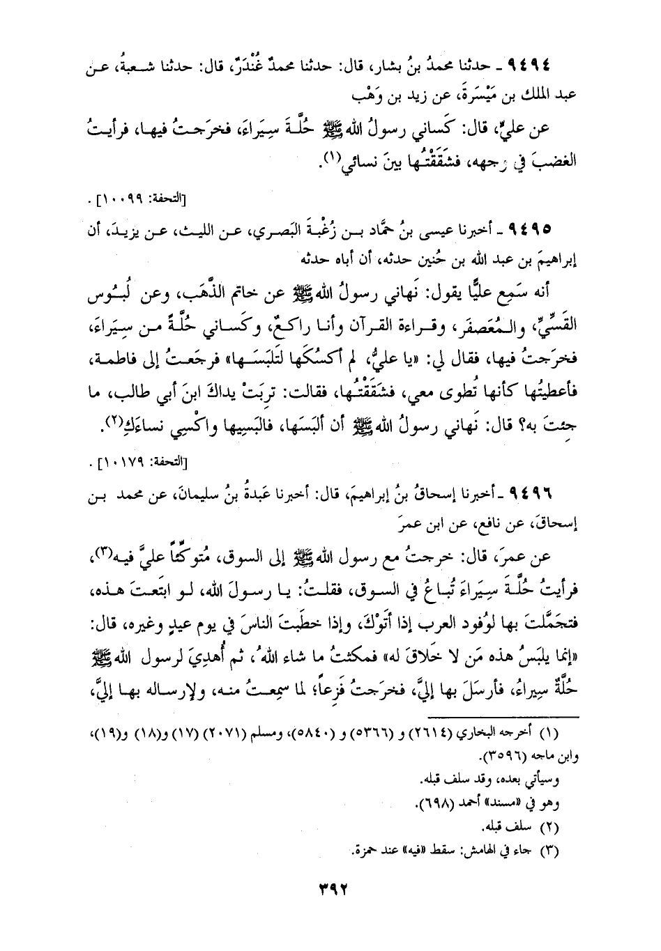 9494 - حَدَّثَنَا مُحَمَّدُ بْنُ بَشَّارٍ، قَالَ: حَدَّثَنَا مُحَمَّدٌ غُنْدَرٌ، قَالَ: حَدَّثَنَا شُعْبَةُ، عَنْ عَبْدِ الْمَلِكِ بْنِ مَيْسَرَةَ، عَنْ زَيْدِ بْنِ وَهْبٍ، عَنْ عَلِيٍّ، قَالَ: «§كَسَانِي رَسُولُ اللهِ صَلَّى اللهُ عَلَيْهِ وَسَلَّمَ حُلَّةً سِيَرَاءَ، فَخَرَجْتُ فِيهَا فَرَأَيْتُ الْغَضَبَ فِي وَجْهِهِ فَشَقَقْتُهَا بَيْنَ نِسَائِي»