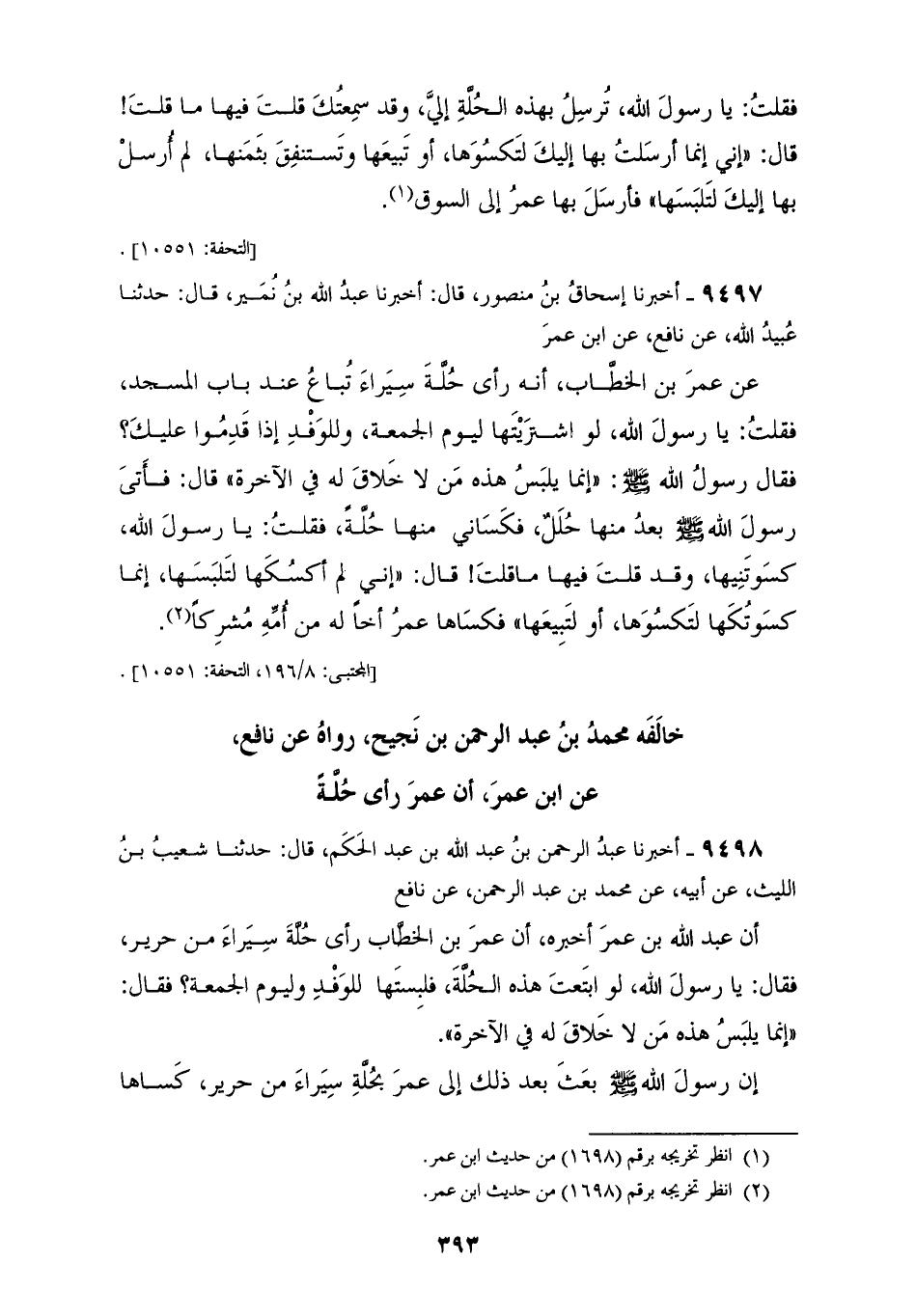 9497 - أَخْبَرَنَا إِسْحَاقُ بْنُ مَنْصُورٍ، قَالَ: أَخْبَرَنَا عَبْدُ اللهِ بْنُ نُمَيْرٍ، قَالَ: حَدَّثَنَا عُبَيْدُ اللهِ، عَنْ نَافِعٍ، عَنِ ابْنِ عُمَرَ، عَنْ عُمَرَ بْنِ الْخَطَّابِ، أَنَّهُ رَأَى حُلَّةً سِيَرَاءَ تُبَاعُ عِنْدَ بَابِ الْمَسْجِدِ، فَقُلْتُ: يَا رَسُولَ اللهِ، لَوِ اشْتَرَيْتَهَا لِيَوْمِ الْجُمُعَةِ، وَلِلْوَفْدِ إِذَا قَدِمُوا عَلَيْكَ، فَقَالَ رَسُولُ اللهِ صَلَّى اللهُ عَلَيْهِ وَسَلَّمَ: «§إِنَّمَا يَلْبَسُ هَذِهِ مَنْ لَا خَلَاقَ لَهُ فِي الْآخِرَةِ»، قَالَ: فَأَتَى رَسُولُ اللهِ صَلَّى اللهُ عَلَيْهِ وَسَلَّمَ بَعْدُ مِنْهَا حُلَلٌ فَكَسَانِي مِنْهَا حُلَّةً، فَقُلْتُ: يَا رَسُولَ اللهِ كَسَوْتَنِيهَا وَقَدْ قُلْتَ فِيهَا مَا قُلْتَ، قَالَ: «إِنِّي لَمْ أَكْسُكَهَا لِتَلْبَسَهَا، إِنَّمَا كَسَوْتُكَهَا لِتَكْسُوَهَا، أَوْ لِتَبِيعَهَا»، فَكَسَاهَا عُمَرُ أَخًا لَهُ مِنْ أُمَّهِ مُشْرِكًا. خَالَفَهُ مُحَمَّدُ بْنُ عَبْدِ الرَّحْمَنِ بْنِ نَجِيحٍ رَوَاهُ عَنْ نَافِعٍ عَنِ ابْنِ عُمَرَ أَنَّ عُمَرَ رَأَى حُلَّةً