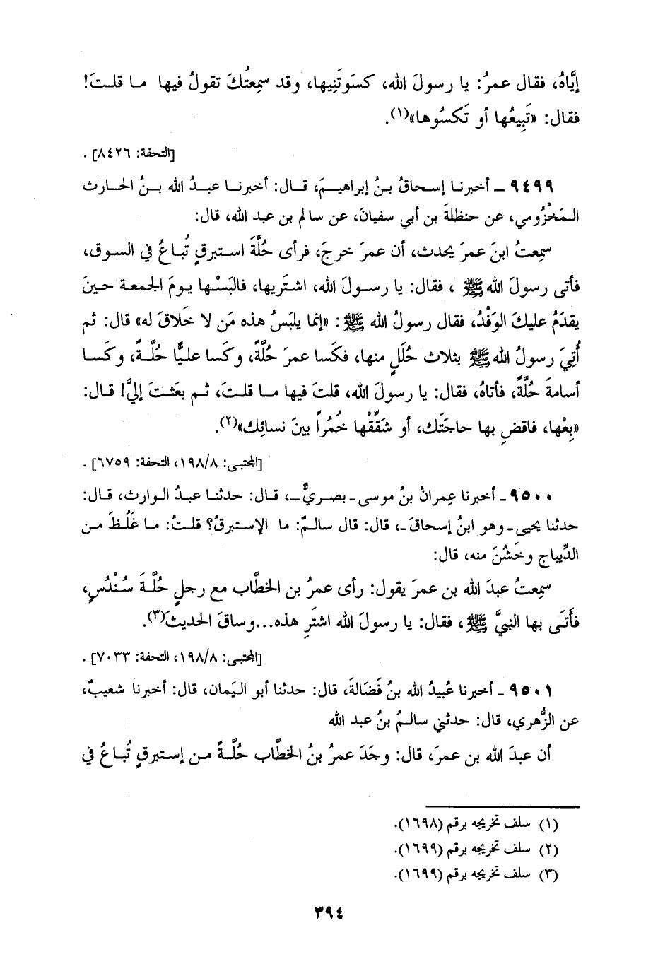 9499 - أَخْبَرَنَا إِسْحَاقُ بْنُ إِبْرَاهِيمَ، قَالَ: أَخْبَرَنَا عَبْدُ اللهِ بْنِ الْحَارِثِ الْمَخْزُومِيُّ، عَنْ حَنْظَلَةَ بْنِ أَبِي سُفْيَانَ، عَنْ سَالِمِ بْنِ عَبْدِ اللهِ، قَالَ: سَمِعْتُ ابْنَ عُمَرَ، يُحَدِّثُ أَنَّ عُمَرَ، خَرَجَ فَرَأَى حُلَّةَ إِسْتَبْرَقٍ تُبَاعُ فِي السُّوقِ فَأَتَى رَسُولُ اللهِ صَلَّى اللهُ عَلَيْهِ وَسَلَّمَ، فَقَالَ: يَا رَسُولَ اللهِ، اشْتَرِهَا فَالْبَسْهَا يَوْمَ الْجُمُعَةِ، حِينَ يَقْدَمُ عَلَيْكَ الْوَفْدُ، فَقَالَ رَسُولُ اللهِ صَلَّى اللهُ عَلَيْهِ وَسَلَّمَ: «§إِنَّمَا يَلْبَسُ هَذِهِ مَنْ لَا خَلَاقَ لَهُ»، قَالَ: ثُمَّ أُتِيَ رَسُولُ اللهِ صَلَّى اللهُ عَلَيْهِ وَسَلَّمَ بِثَلَاثِ حُلَلٍ مِنْهَا، فَكَسَا عُمَرُ حُلَّةً، وَكَسَا عَلِيًّا حُلَّةً، وَكَسَا أُسَامَةَ حُلَّةً، فَأَتَاهُ، فَقَالَ: يَا رَسُولَ اللهِ، قُلْتَ فِيهَا مَا قُلْتَ، ثُمَّ بَعَثْتَ إِلَيَّ، قَالَ: «بِعْهَا فَاقْضِ بِهَا حَاجَتَكَ، أَوْ شَقِّقْهَا خُمُرًا بَيْنَ نِسَائِكَ»