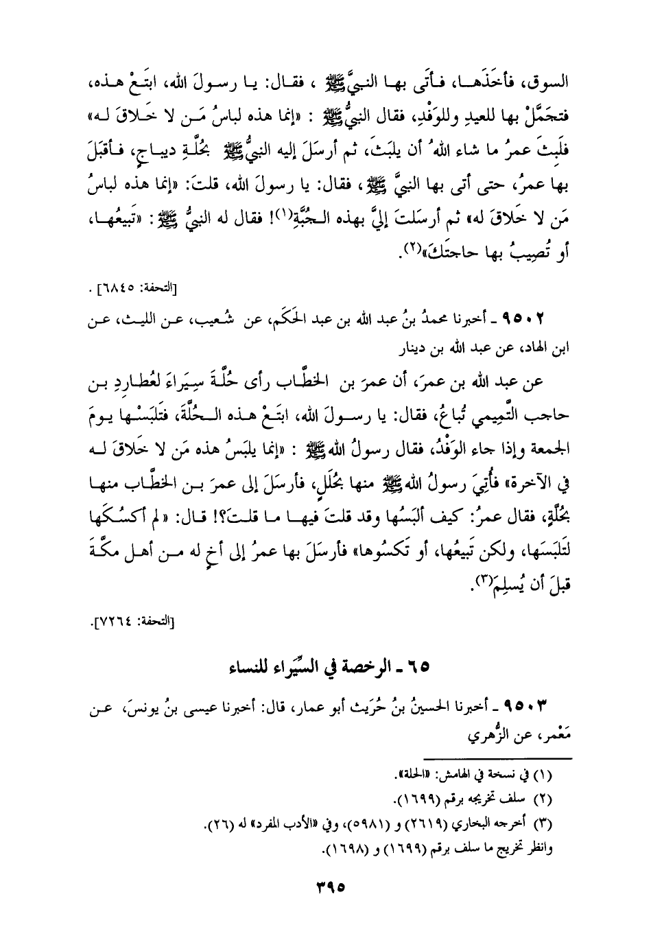 9502 - أَخْبَرَنَا مُحَمَّدُ بْنُ عَبْدِ اللهِ بْنِ عَبْدِ الْحَكَمِ، عَنْ شُعَيْبٍ، عَنِ اللَّيْثِ، عَنِ ابْنِ الْهَادِ، عَنْ عَبْدِ اللهِ بْنِ دِينَارٍ، عَنْ عَبْدِ اللهِ بْنِ عُمَرَ، أَنَّ عُمَرَ بْنَ الْخَطَّابِ، رَأَى حُلَّةً سِيَرَاءَ لِعُطَارِدِ بْنِ حَاجِبٍ التَّمِيمِيِّ تُبَاعُ، فَقَالَ يَا رَسُولَ اللهِ: ابْتَعْ هَذِهِ الْحُلَّةَ فَتَلْبَسَهَا يَوْمَ الْجُمُعَةِ، وَإِنْ جَاءَ الْوَفْدُ، فَقَالَ رَسُولُ اللهِ صَلَّى اللهُ عَلَيْهِ وَسَلَّمَ: «§إِنَّمَا يَلْبَسُ هَذِهِ مَنْ لَا خَلَاقَ لَهُ فِي الْآخِرَةِ»: فَأُتِيَ رَسُولُ اللهِ صَلَّى اللهُ عَلَيْهِ وَسَلَّمَ مِنْهَا بِحُلَلٍ، فَأَرْسَلَ إِلَى عُمَرَ بْنِ الْخَطَّابِ مِنْهَا بِحُلَّةٍ، فَقَالَ عُمَرُ: كَيْفَ أَلْبَسُهَا وَقَدْ قُلْتَ فِيهَا مَا قُلْتَ؟ قَالَ: «لَمْ أَكْسُكَهَا لِتَلْبَسَهَا، وَلَكِنْ تَبِيعُهَا أَوْ تَكْسُوهَا»: فَأَرْسَلَ بِهَا عُمَرُ إِلَى أَخٍ لَهُ مِنْ أَهْلِ مَكَّةَ قَبْلَ أَنْ يُسْلِمَ