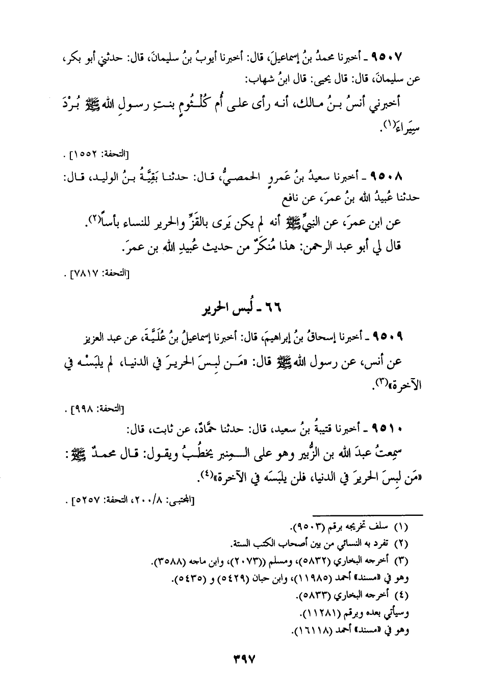 9507 - أَخْبَرَنَا مُحَمَّدُ بْنُ إِسْمَاعِيلَ، قَالَ: أَخْبَرَنَا أَيُّوبُ بْنُ سُلَيْمَانَ، قَالَ: حَدَّثَنِي أَبُو بَكْرٍ، عَنْ سُلَيْمَانَ، قَالَ: قَالَ يَحْيَى، قَالَ ابْنُ شِهَابٍ: أَخْبَرَنِي أَنَسُ بْنُ مَالِكٍ، " §أَنَّهُ رَأَى عَلَى أُمِّ كُلْثُومٍ بِنْتِ رَسُولِ اللهِ صَلَّى اللهُ عَلَيْهِ وَسَلَّمَ بُرْدَ سِيَرَاءَ