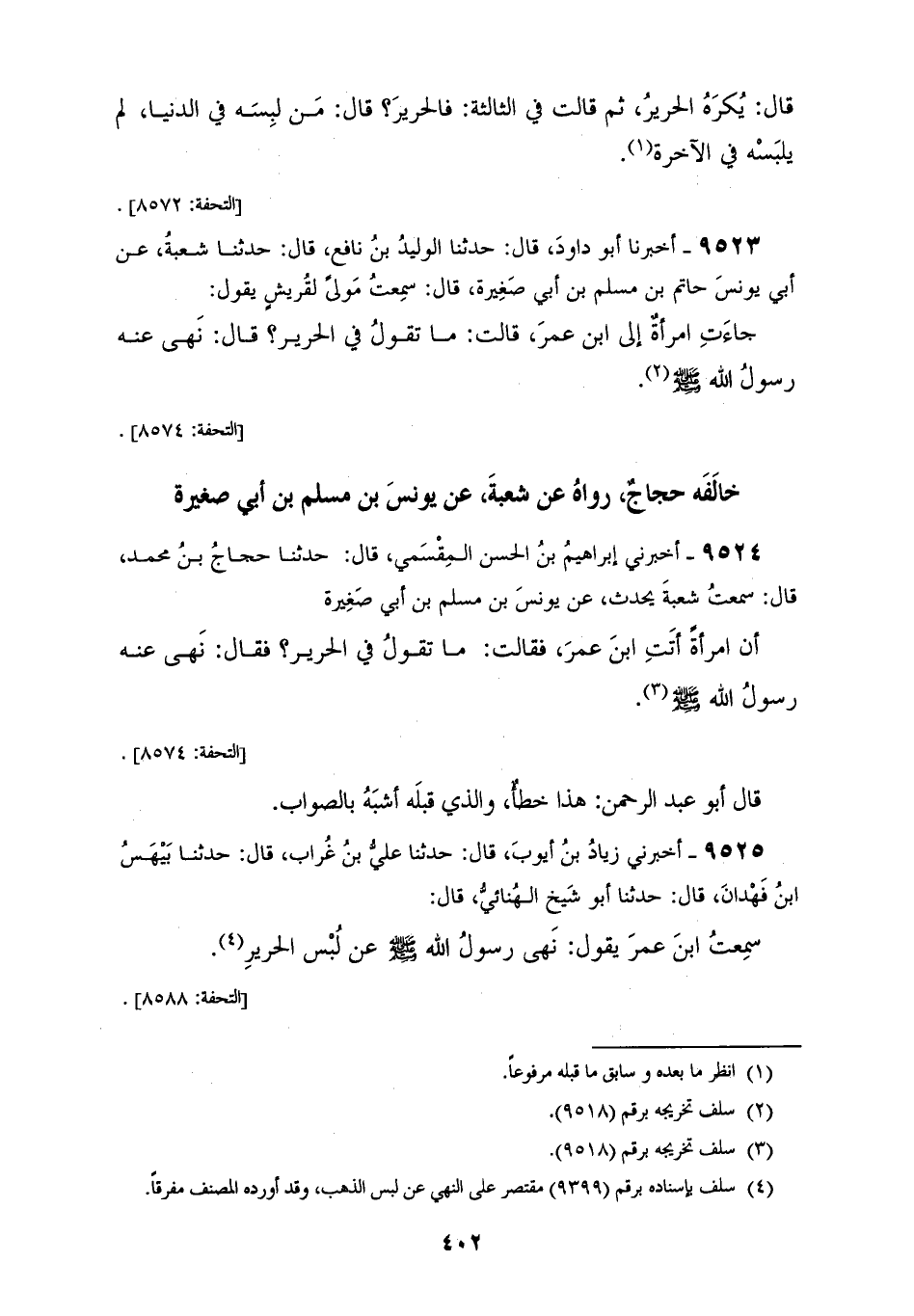 9524 - أَخْبَرَنِي إِبْرَاهِيمُ بْنُ الْحَسَنِ الْمِقْسَمِيُّ، قَالَ: حَدَّثَنَا حَجَّاجُ بْنُ مُحَمَّدٍ، قَالَ: سَمِعْتُ شُعْبَةَ، يُحَدِّثُ عَنْ يُونُسَ بْنِ مُسْلِمِ بْنِ أَبِي صَغِيرَةَ، أَنَّ امْرَأَةً، أَتَتِ ابْنَ عُمَرَ فَقَالَتْ: " مَا تَقُولُ فِي الْحَرِيرِ؟ فَقَالَ: §نَهَى عَنْهُ رَسُولُ اللهِ صَلَّى اللهُ عَلَيْهِ وَسَلَّمَ "، قَالَ أَبُو عَبْدِ الرَّحْمَنِ: هَذَا خَطَأٌ، وَالَّذِي قَبْلَهُ أَشْبَهُ بِالصَّوَابِ