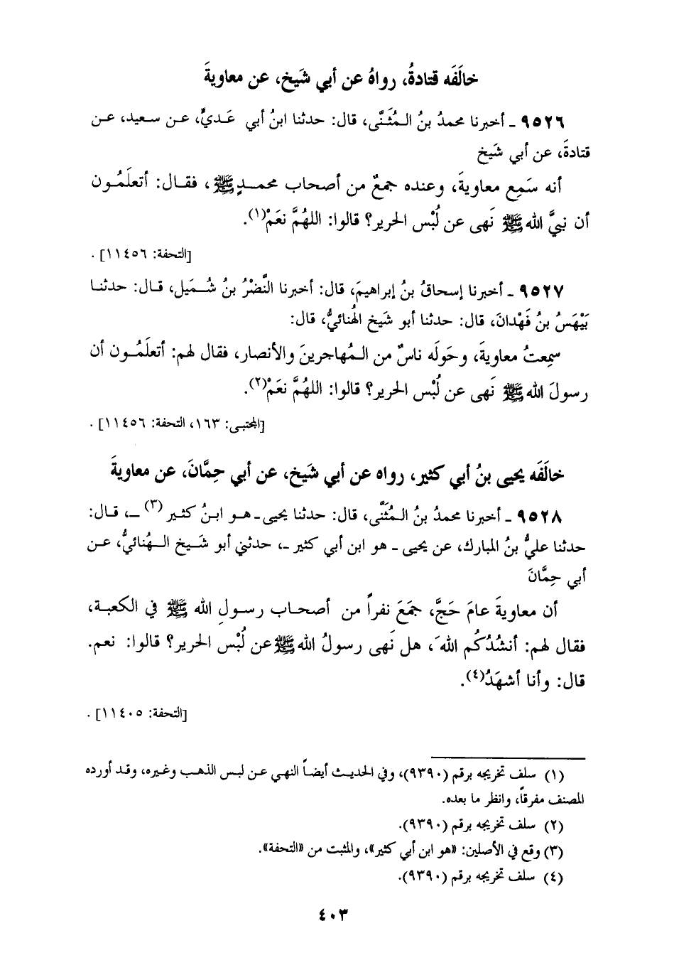 9528 - أَخْبَرَنَا مُحَمَّدُ بْنُ الْمُثَنَّى، قَالَ: حَدَّثَنَا يَحْيَى هو ابْنُ كَثِيرٍ، قَالَ: حَدَّثَنَا عَلِيُّ بْنُ الْمُبَارَكِ، عَنْ يَحْيَى هو ابْنُ أبي كَثِيرٍ، حَدَّثَنِي أَبُو شَيْخٍ الْهُنَائِيُّ، عَنْ أَبِي حِمَّانَ، أَنَّ مُعَاوِيَةَ، عَامَ حَجَّ جَمَعَ نَفَرًا مِنْ أَصْحَابِ رَسُولِ اللهِ صَلَّى اللهُ عَلَيْهِ وَسَلَّمَ فِي الْكَعْبَةِ، فَقَالَ لَهُمْ: " أَنْشُدُكُمُ اللهَ، §هَلْ نَهَى رَسُولُ اللهِ صَلَّى اللهُ عَلَيْهِ وَسَلَّمَ عَنْ لُبْسِ الْحَرِيرِ؟ قَالُوا: نَعَمْ، قَالَ: وَأَنَا أَشْهَدُ -[404]-. خَالَفَهُ حَرْبٌ رَوَاهُ عَنْ يَحْيَى، عَنْ أَبِي شَيْخٍ، عَنْ أَخِيهِ حِمَّانَ، عَنْ مُعَاوِيَةَ