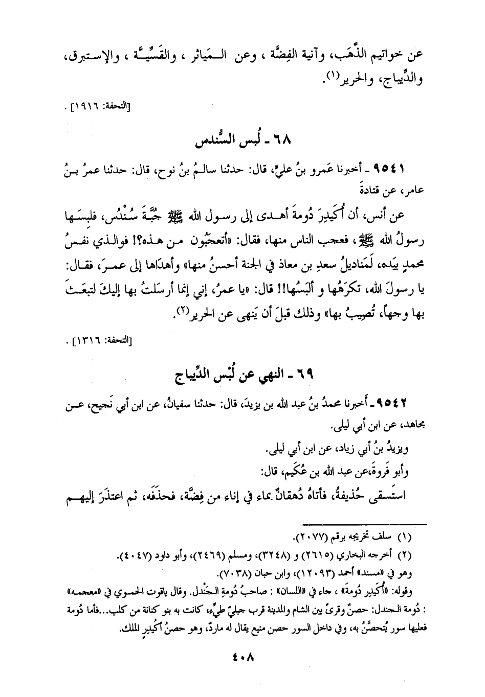 9541 - أَخْبَرَنَا عَمْرُو بْنُ عَلِيٍّ، قَالَ: حَدَّثَنَا سَالِمُ بْنُ نُوحٍ، قَالَ: حَدَّثَنَا عُمَرُ بْنُ عَامِرٍ، عَنْ قَتَادَةَ، عَنْ أَنَسٍ، " أَنَّ أُكَيْدِرَ دُومَةَ أَهْدَى إِلَى رَسُولِ اللهِ صَلَّى اللهُ عَلَيْهِ وَسَلَّمَ جُبَّةَ سُنْدُسٍ فَلَبِسَهَا رَسُولُ اللهِ صَلَّى اللهُ عَلَيْهِ وَسَلَّمَ فَعَجِبَ النَّاسُ مِنْهَا، فَقَالَ: «أَتَعْجَبُونَ مِنْ هَذِهِ؟ فَوَالَّذِي نَفْسُ مُحَمَّدٍ بِيَدِهِ §لَمَنَادِيلُ سَعْدِ بْنِ مُعَاذٍ فِي الْجَنَّةِ أَحْسَنُ مِنْهَا» وَأَهْدَاهَا إِلَى عُمَرَ، فَقَالَ: يَا رَسُولَ اللهِ، تَكْرَهُهَا وَأَلْبَسُهَا، قَالَ: «يَا عُمَرُ، إِنِّي إِنَّمَا أَرْسَلْتُ بِهَا إِلَيْكَ لِتَبْعَثَ بِهَا وَجْهًا تُصِيبُ بِهَا، وَذَلِكَ قَبْلَ أَنْ يَنْهَى عَنِ الْحَرِيرِ»