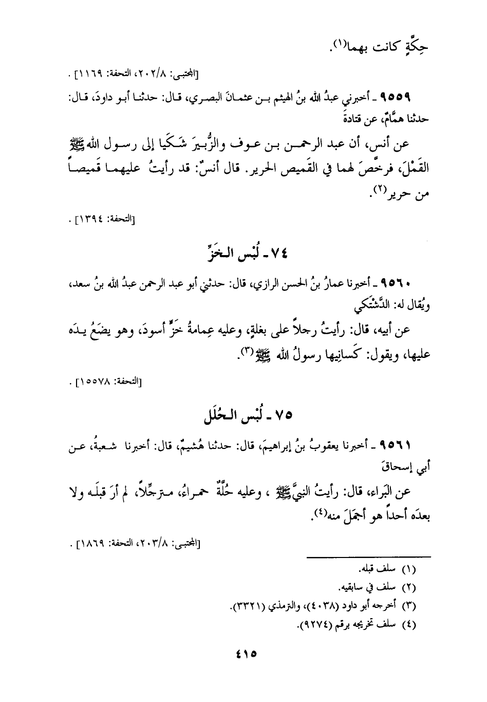 9559 - أَخْبَرَنِي عَبْدُ اللهِ بْنُ الْهَيْثَمِ بْنِ عُثْمَانَ الْبَصْرِيُّ، قَالَ: حَدَّثَنَا أَبُو دَاوُدَ، قَالَ: حَدَّثَنَا هَمَّامٌ، عَنْ قَتَادَةَ، عَنْ أَنَسٍ، أَنَّ عَبْدَ الرَّحْمَنِ بْنَ عَوْفٍ، وَالزُّبَيْرَ، شَكَيَا إِلَى رَسُولِ اللهِ صَلَّى اللهُ عَلَيْهِ وَسَلَّمَ الْقَمْلَ §فَرَخَّصَ لَهُمَا فِي الْقَمِيصِ الْحَرِيرِ، قَالَ أَنَسٌ: قَدْ رَأَيْتُ عَلَيْهِمَا قَمِيصًا مِنْ حَرِيرٍ