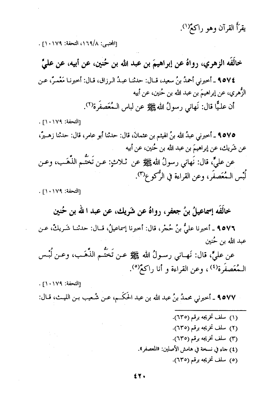9576 - أَخْبَرَنَا عَلِيُّ بْنُ حُجْرٍ، قَالَ: أَخْبَرَنَا إِسْمَاعِيلُ، قَالَ: حَدَّثَنَا شَرِيكٌ، عَنْ عَبْدِ اللهِ بْنِ حُنَيْنٍ، عَنْ عَلِيٍّ، قَالَ: «§نَهَانِي رَسُولُ اللهِ صَلَّى اللهُ عَلَيْهِ وَسَلَّمَ عَنْ تَخَتُّمِ الذَّهَبِ، وَعَنْ لُبْسِ الْمُعَصْفَرَةِ، وَعَنِ الْقِرَاءَةِ وَأَنَا رَاكِعٌ»